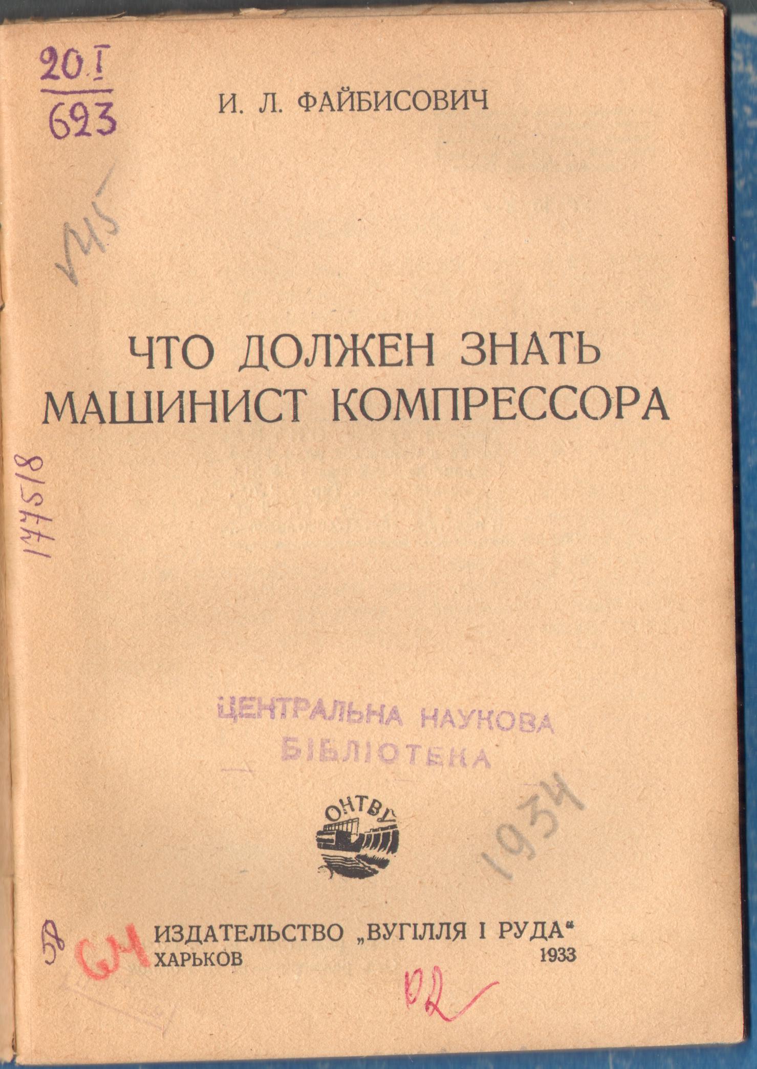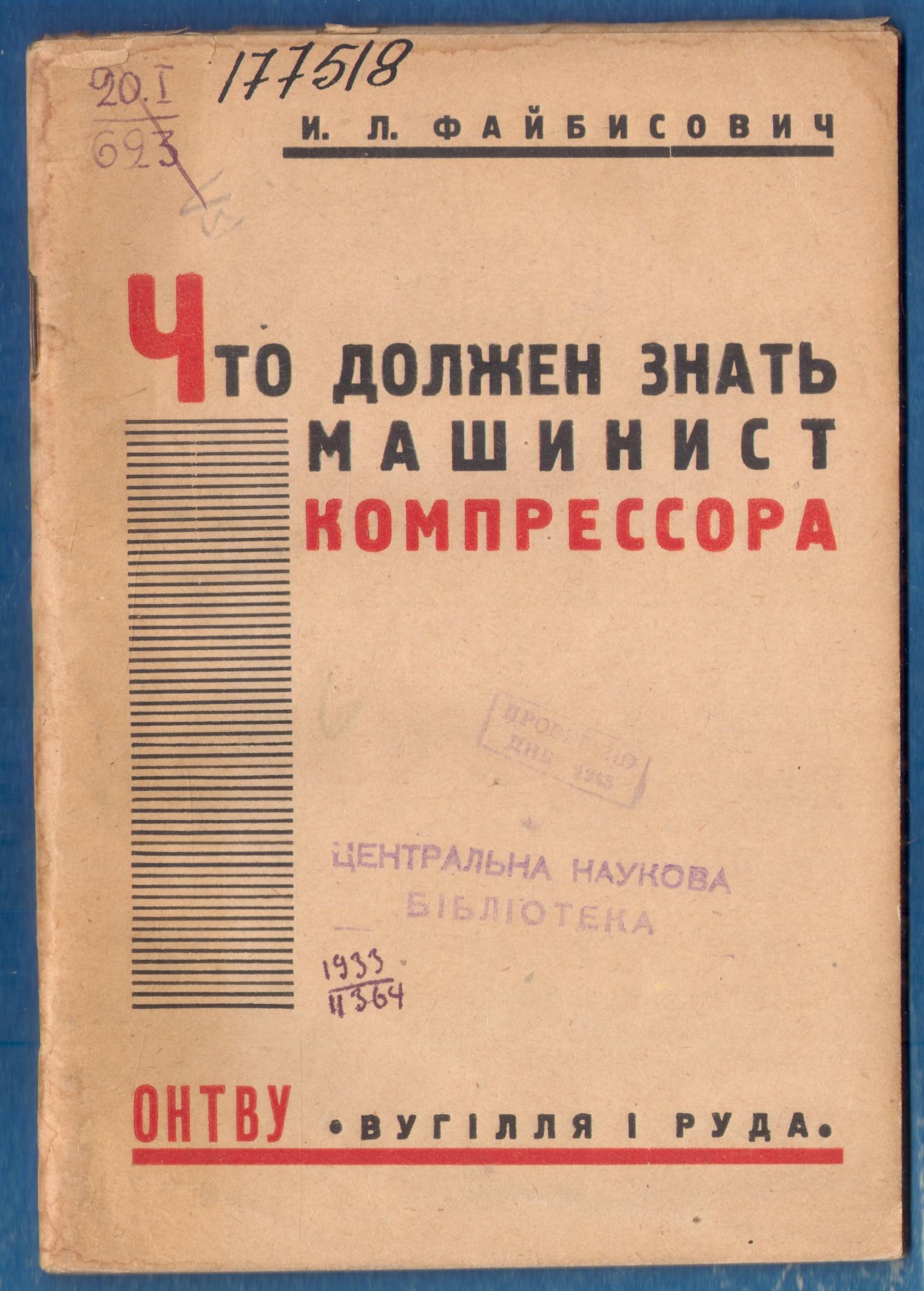 Файбисович, Исаак Львович. Что должен знать машинист компрессора? / И.Л. Файбисович. – Харьков: Издательство «Вугілля і руда», 1933. – 40 с. : ил.