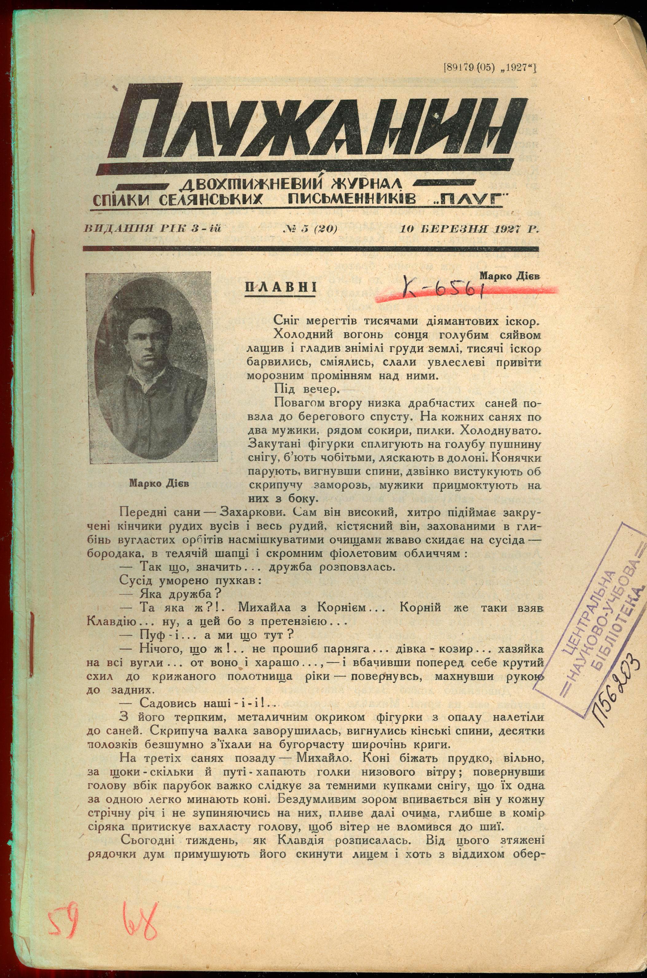 Плужанин : двохтижневий ілюстрований літературно-художній і критичний журнал Спілки селянських письменників «Плуг» . – Харків : ЦК Плуга , 1927 . – № 5(20) (10 березня). – 44 с.