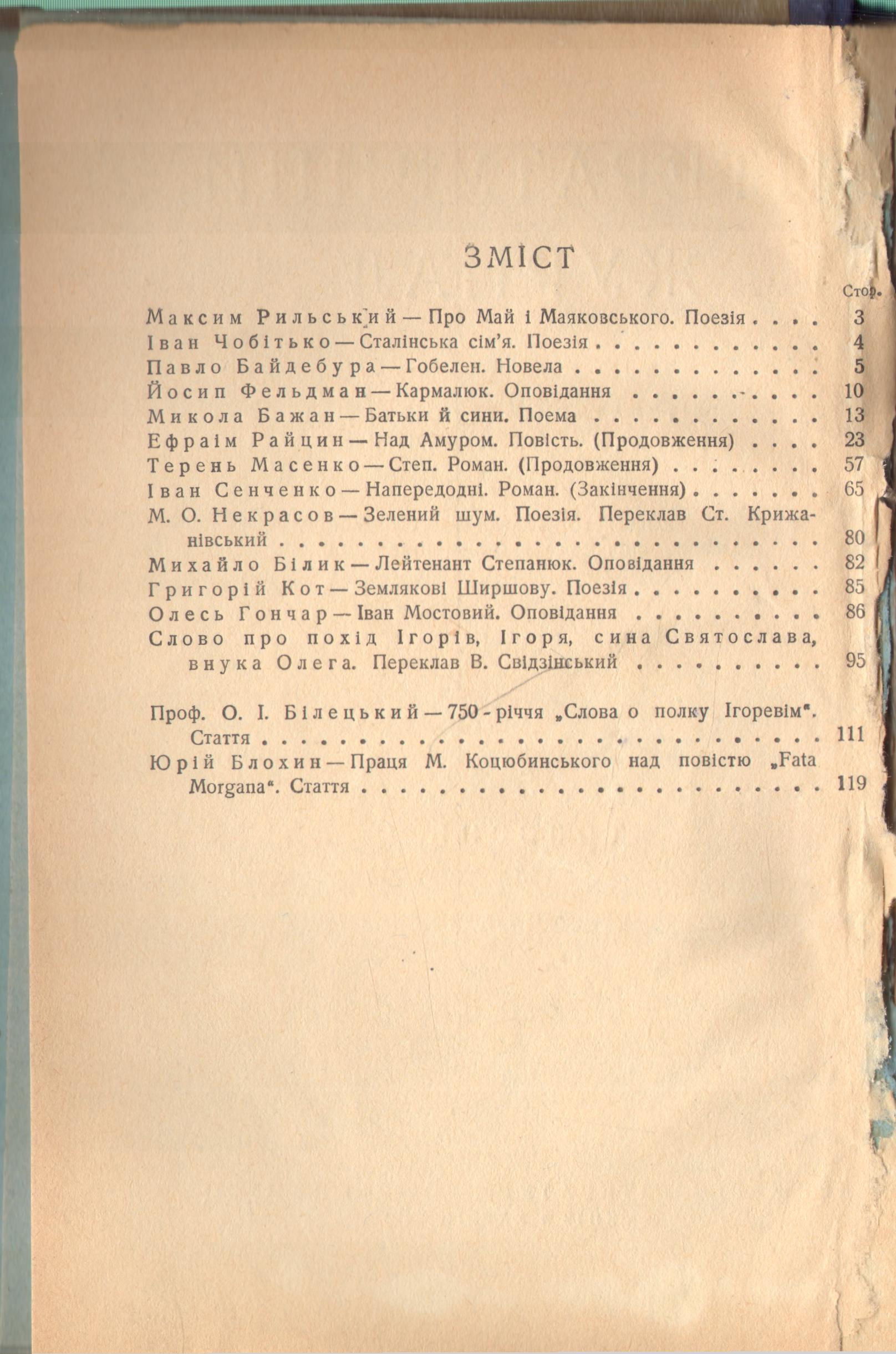 Research Subject Categories::SOCIAL SCIENCES::Other social sciences::Mass communication, Research Subject Categories::HUMANITIES and RELIGION::Aesthetic subjects::Literature, Research Subject Categories::HUMANITIES and RELIGION::History and philosophy subjects::History subjects::History, Research Subject Categories::HUMANITIES and RELIGION::History and philosophy subjects::History subjects::Book and library history, Kharkiv magazine, Харків, українська література, література, українська проза, українська поезія, українські письменники, Рильський Максим, Чобітько Іван, Байдебура Павло, Гобелен (новела), Фельдман Йосип, Кармалюк (оповідання), Бажан Микола, Батьки й сини (поема), Райцин Ефраім, Над Амуром (повість), Сенченко Іван, Напередодні (роман), Масенко Терень, Степ (роман), Некрасов М.О., Крижанівський Ст., Білик Михайло, Лейтенант Степанюк (оповідання), Кот Григорій, Гончар Олесь, Іван Мостовий (оповідання), Слово про похід Ігорів, Ігоря, сина Святослава, внука Олега, Свідзінський Володимир, Білецький О.І., 750-річчя «Слова о полку Ігоревім» (стаття), Блохин Юрій, Праця М. Коцюбинського над повістю «Fata Morgana»(стаття), Коцюбинський Михайло, історія української літератури, Ироическая песнь о походе на половцев удельнаго князя Новагорода-Северскаго Игоря Святославича, писанная старинным русским языком в исходе XII столетия с переложением на употребляемое ныне наречие, Москва : В Сенатской типографии, 1800