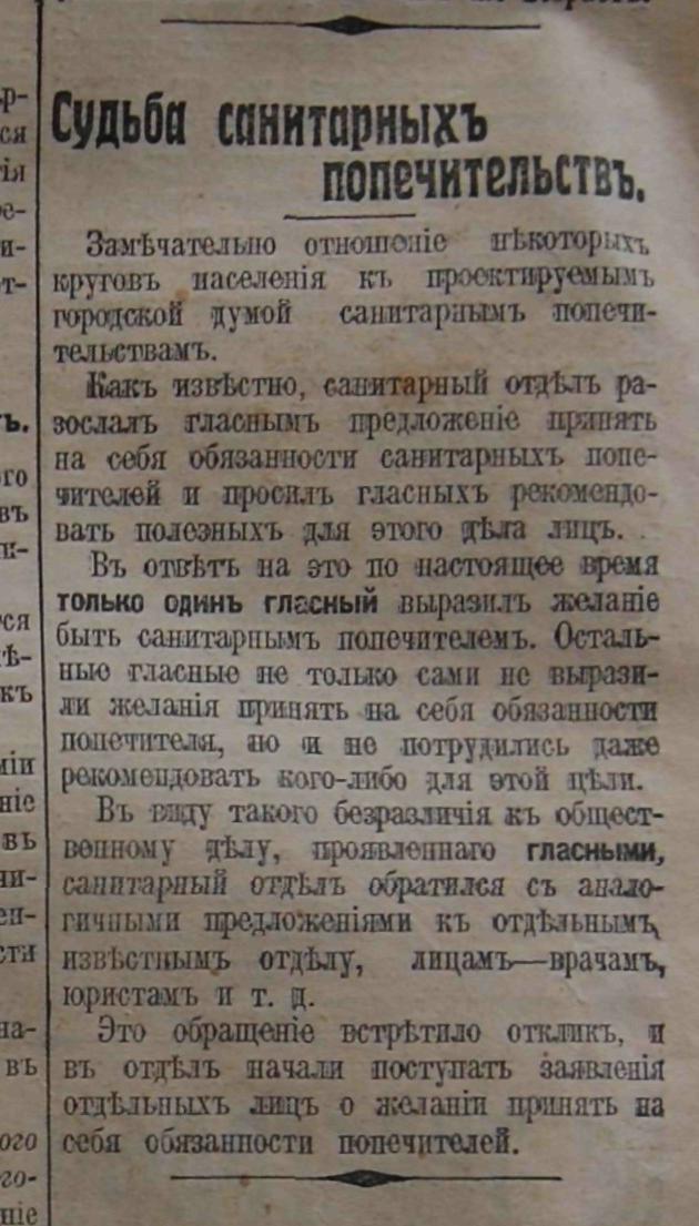Судьба санитарных попечительств // Утро. – 1913. – 24 сентября (№ 2089). – С. 4.