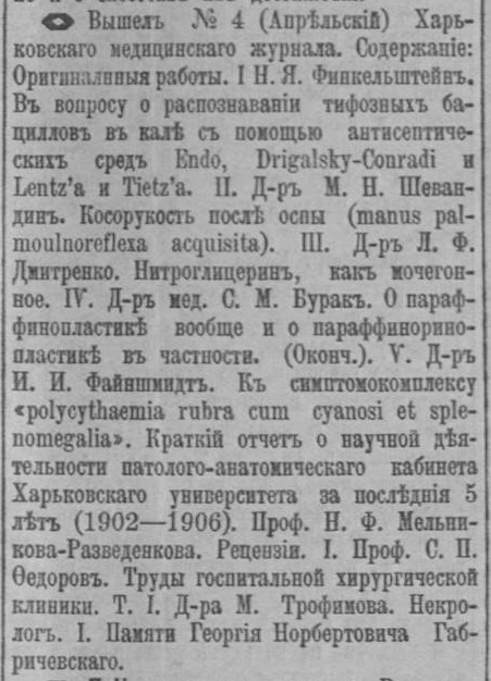 Вышел №4 Харьковского медицинского журнала // Утро : политическая, общественная, литературная и экономическая газета. 1907, 20 апреля (№ 125). – Харьков, 1907. – С. 4.