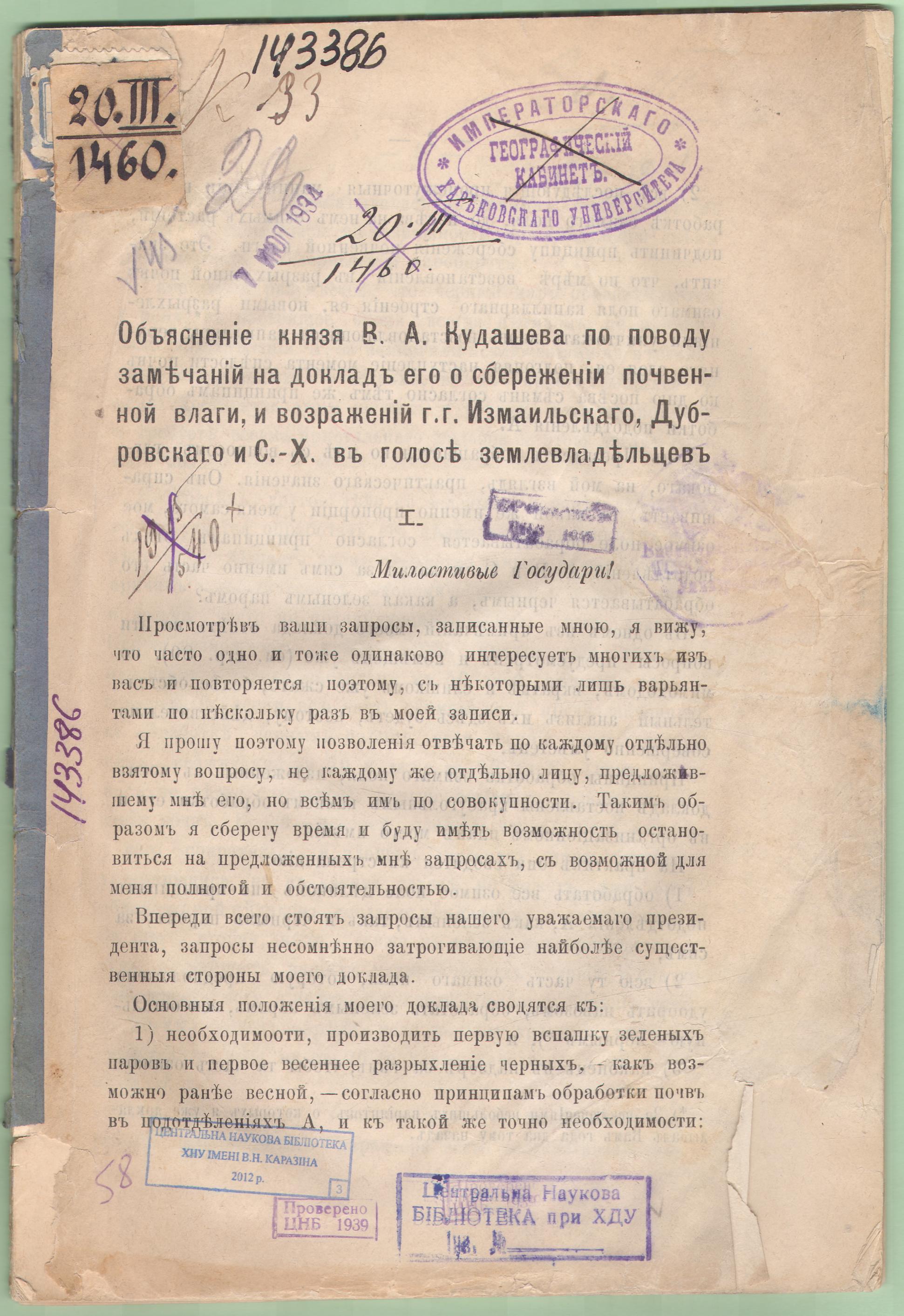Кудашев, Владимир Александрович. Объяснение князя В.А. Кудашева по поводу замечания на доклад его о сбережении почвенной влаги, и возражений гг. Измаильского, Дубровского и С.-Х. в голосе землевладельцев / В.А. Кудашев . – Полтава : Типо-литография Л. Фришберга , [1892] . – 75 с. – Подпись кн. П.[В.]А. Кудашев.