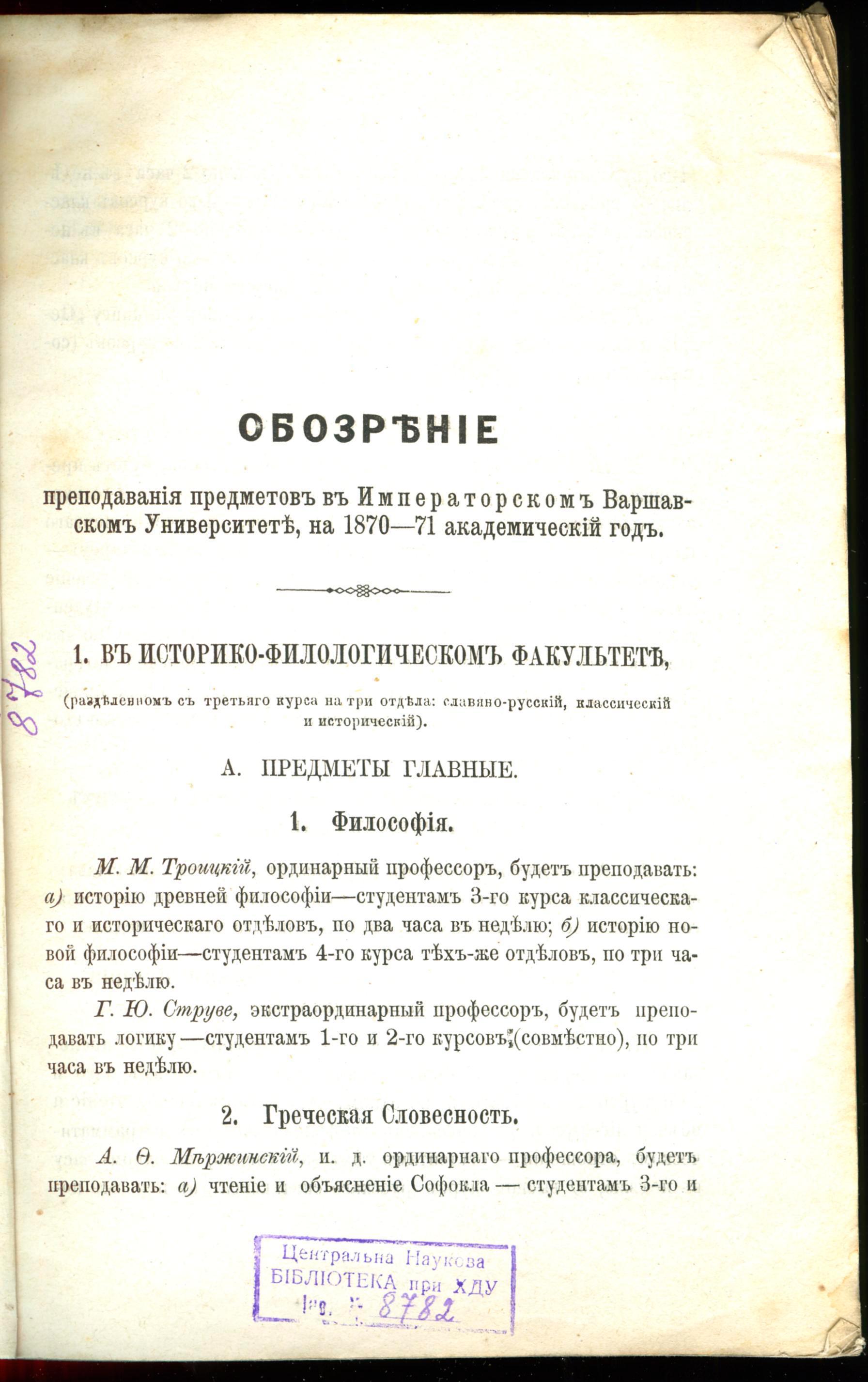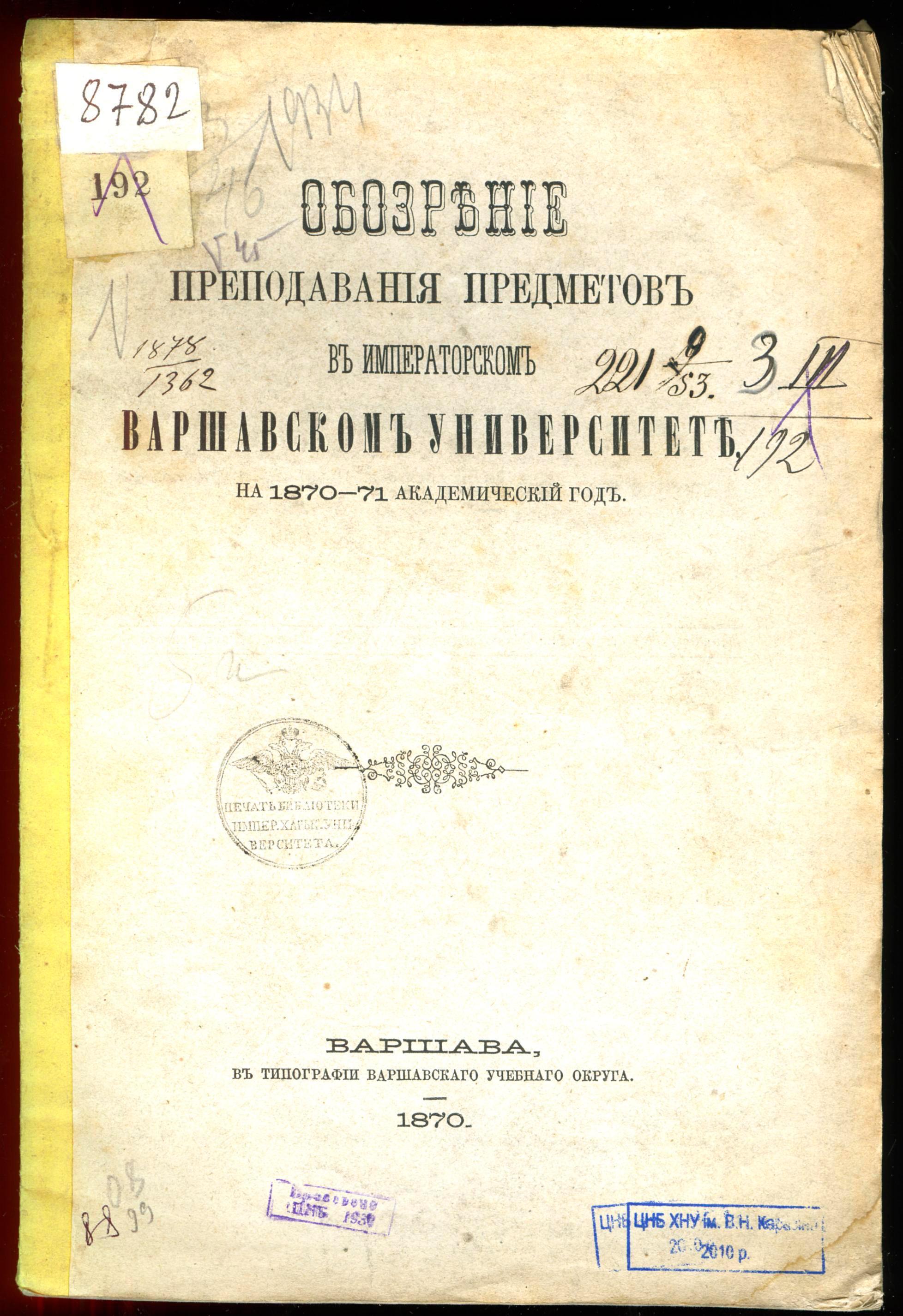 Обозрение преподавания предметов в Императорском Варшавском университете на 1870–71 академический год