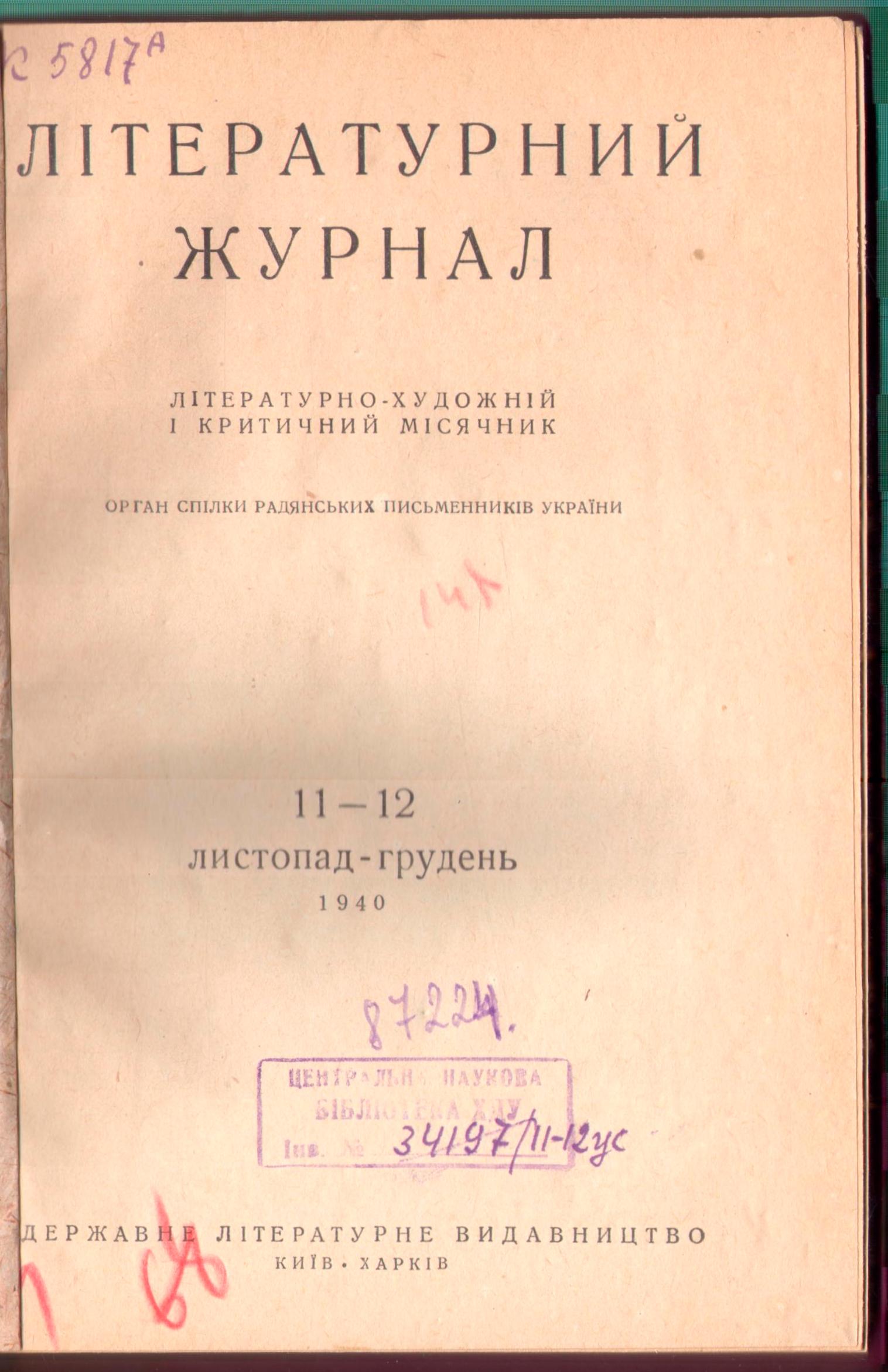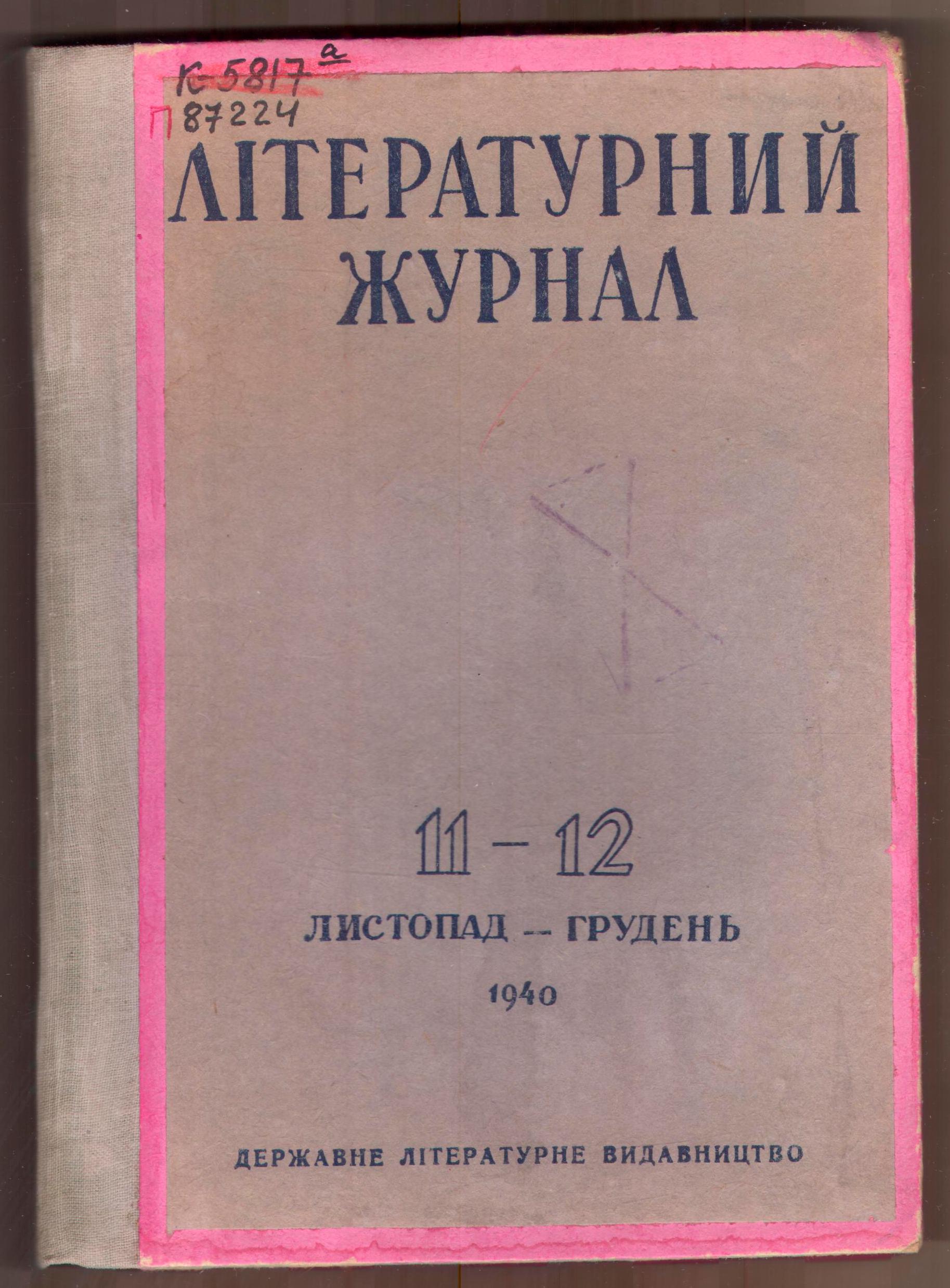 Літературний журнал : літературно-художній і критичний місячник . – Київ ; Харків : Державне літературне видавництво , 1940 . – № 11–12 (листопад–грудень) . – 240 с. ; 1 вклад. арк.