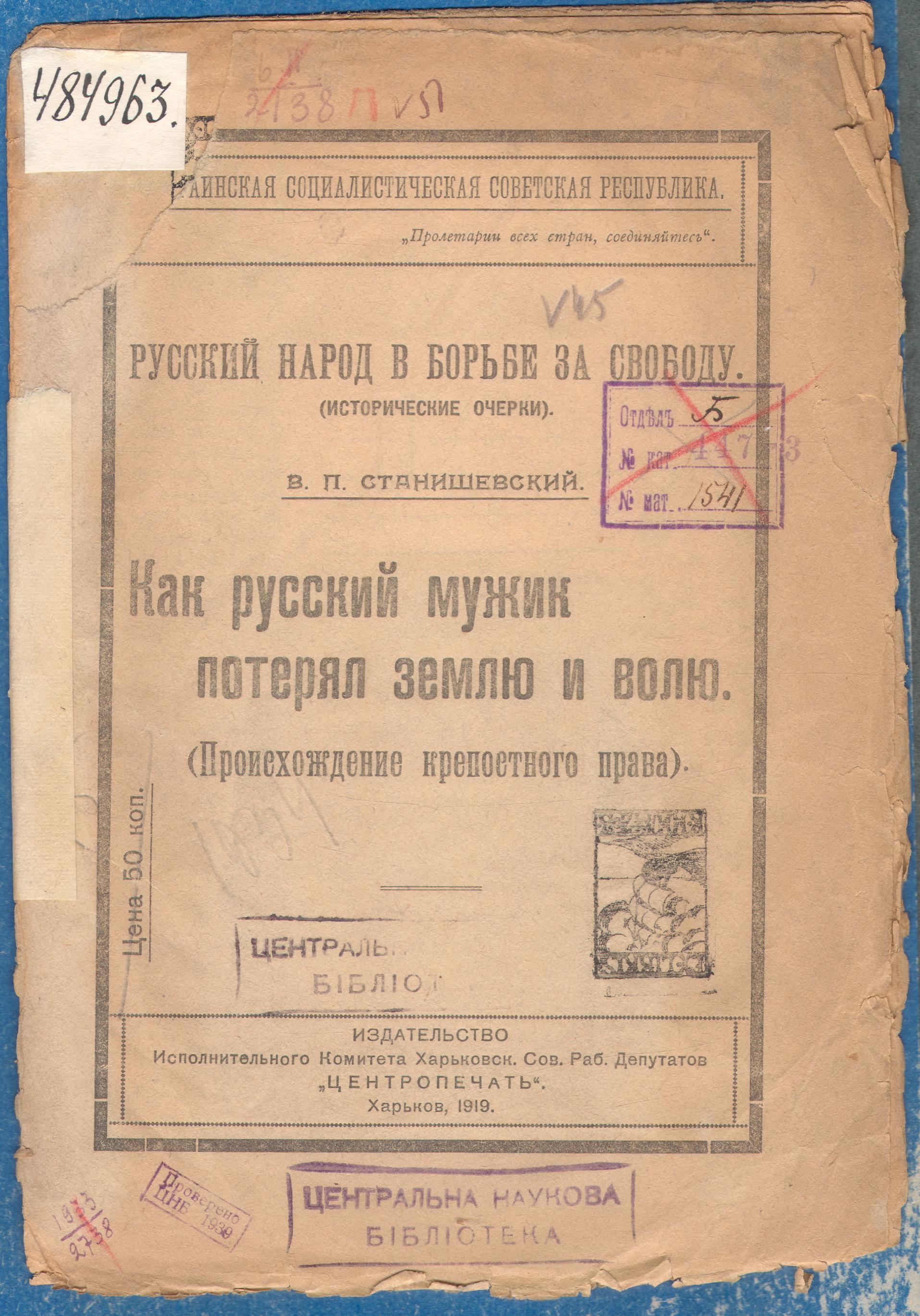 Станишевский В.П. Как русский мужик потерял землю и волю. (Происхождение крепостного права) / В.П. Станишевский. – Харьков : Издательство Исполнительного комитета Харьковск. Сов. Раб. Депутатов «Центропечать», 1919. – 16 с.