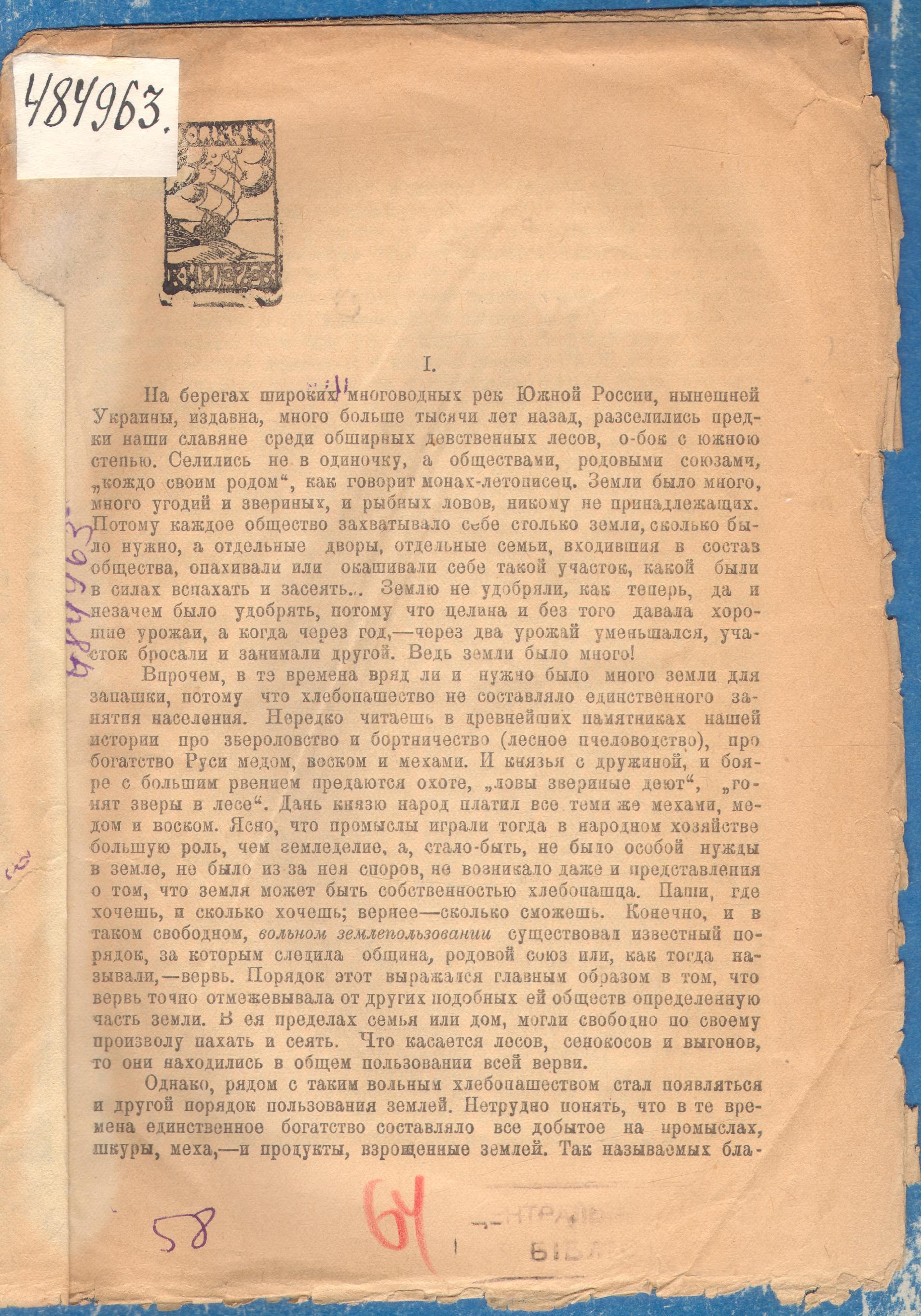 На берегах широких багатоводних річок Південної Росії, нинішньої України, здавна, багато більше тисячі років тому, розселилися предки наші слов'яни серед величезних незайманих лісів, осторонь з південним степом. Селились не поодинці, а товариствами, родовими спілками, „шкіро своїм родом”, як каже чернець-літописець. Землі було багато, багато угідь і звіриних, і риболовлі, нікому не належать. Тому кожне суспільство захоплювало собі стільки землі, скільки було потрібно, а окремі двори, окремі сім'ї, що входили до складу товариства, орали або окошували собі таку ділянку, якою були в силі зорати і засіяти... Землю не піддобрювали, як тепер, та й нема чого було удобрювати, бо цілина і без того давала хороші врожаї. Адже землі було багато! Втім, у ті часи навряд чи й потрібно було багато землі для оранки, бо хліборобство не становило єдиного заняття населення.