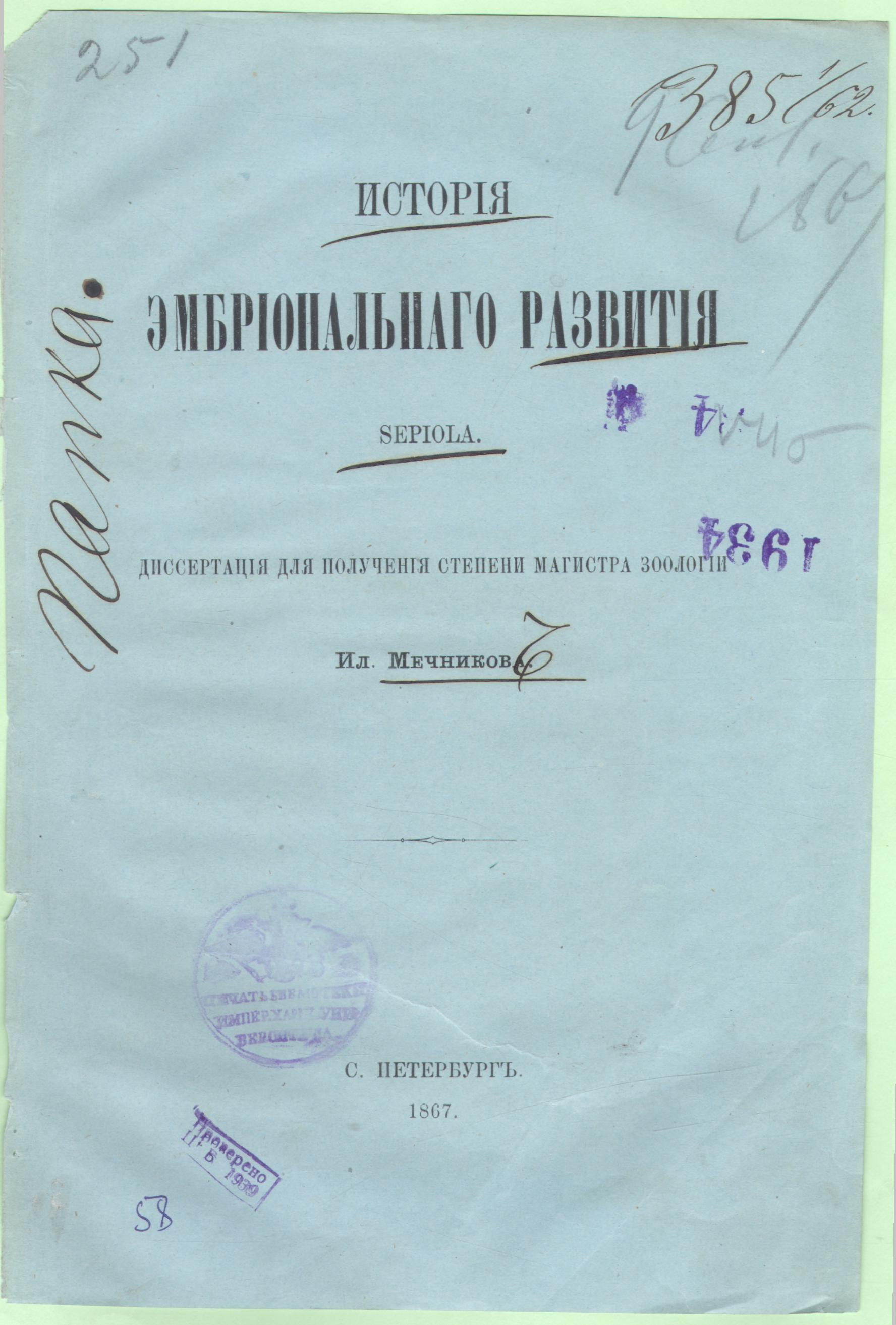 Мечников, Илья Ильич. История эмбрионального развития Sepiola : диссертация для получения степени магистра зоологии Ил. Мечникова. – С. Петербург: Типография Куколь-Яснопольского, 1867. – 72 с.