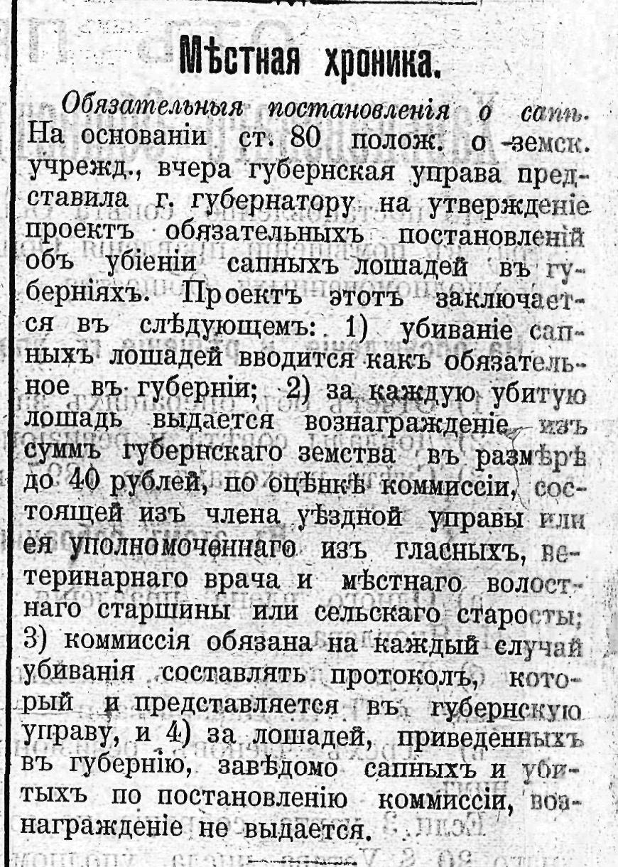 Обязательные постановления о сапе // Южный край: ежедневное издание. – Харьков, 1897. – 7 февраля. – № 5527. – С. 2.