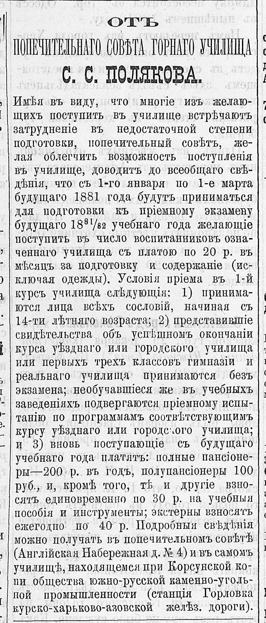От Попечительного совета Горного училища С.С. Полякова // Южный край : ежедневное издание. – Харьков, 1881. – 4 (16) января. – № 3. – С. 4.