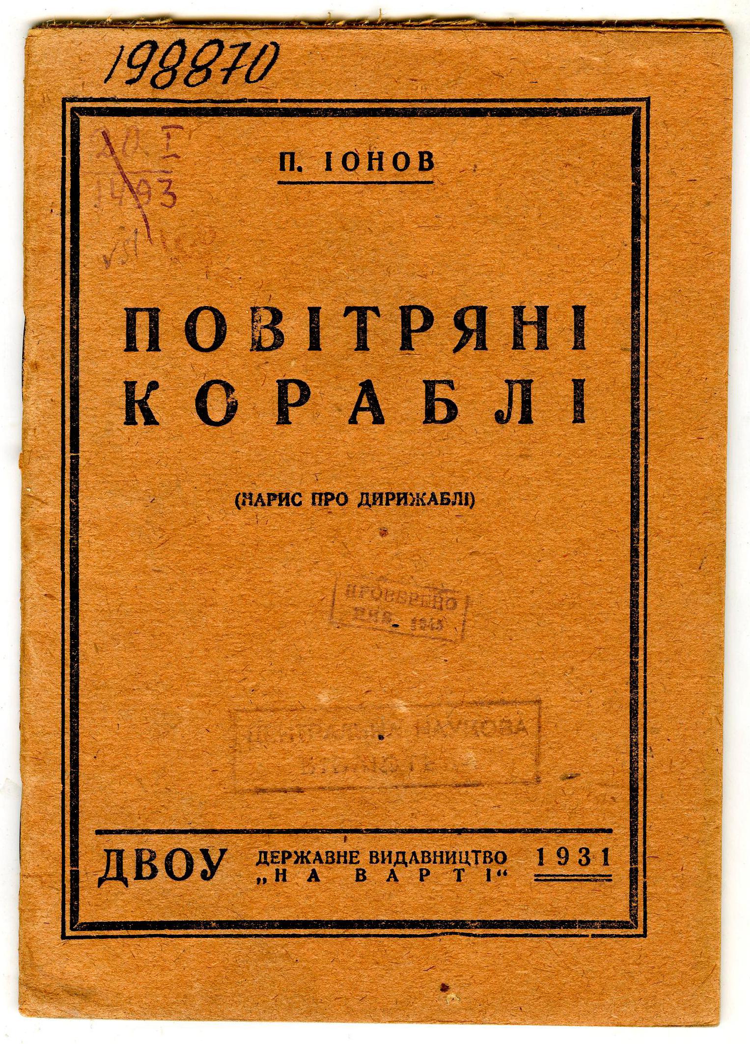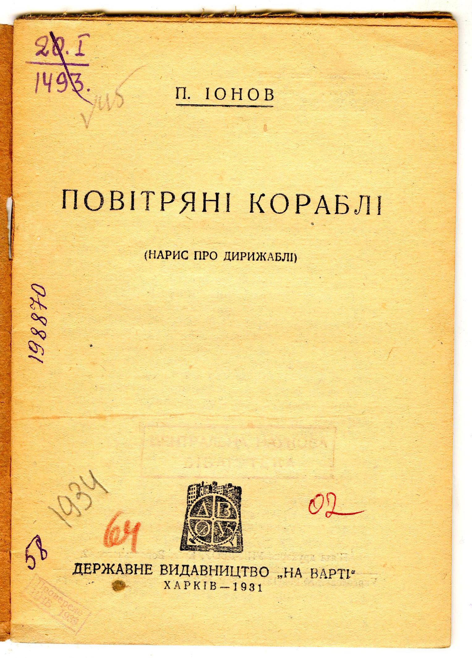 Іонов, Петро Павлович. Повітряні кораблі (нарис про дирижаблі) / П.П. Іонов. – Харків: На варті, 1931. – 24 с.
