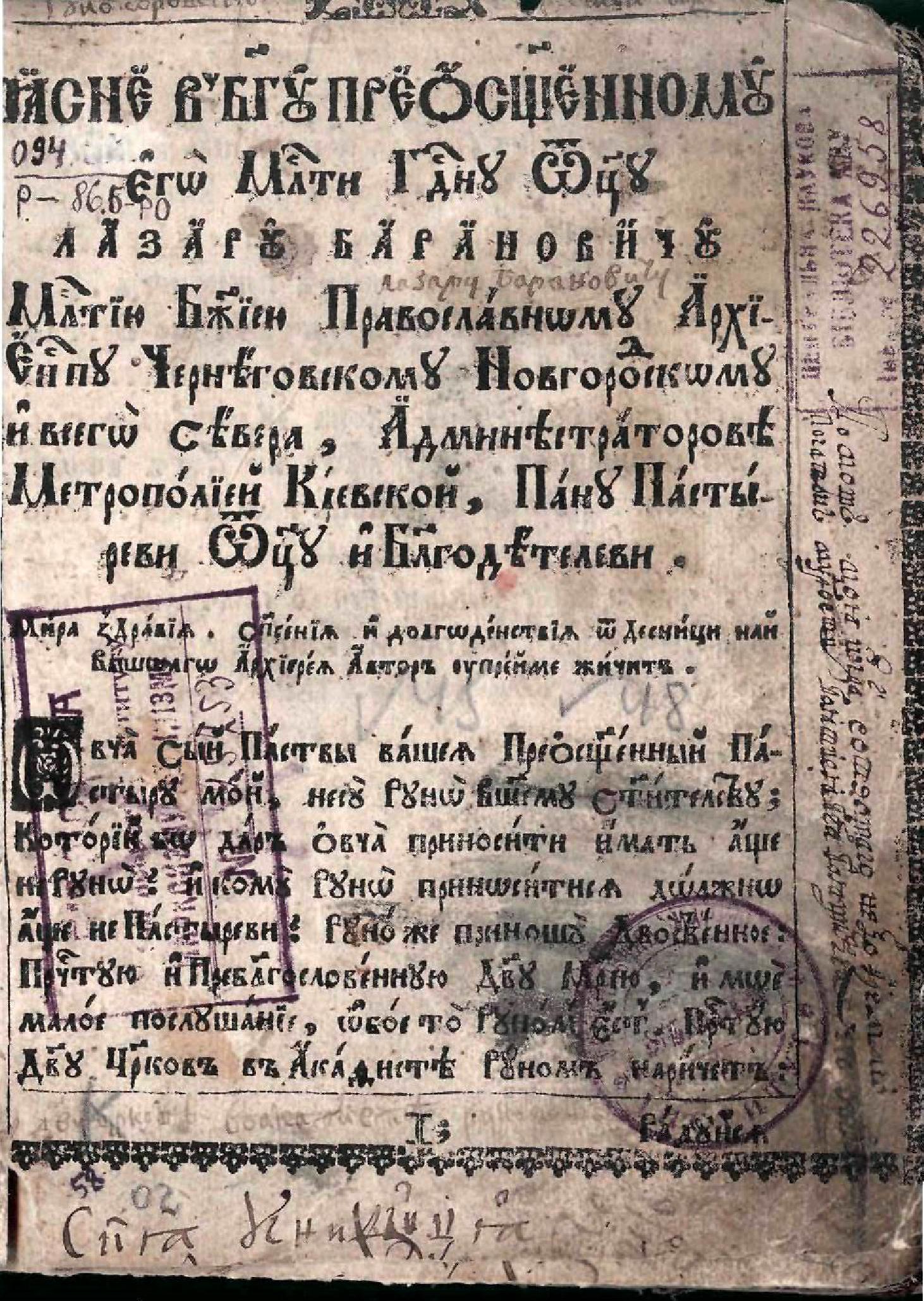 Dimitriy Tuptalo (Rostovskiy) (1651-1709) – Metropolitan of Rostov, was canonized. The author of the capital Chetih-Saints, of many historical and theological works. The book is dedicated to the archbishop Lazarus Baranovich. Contains stories about the miracles of the Icon of the Blessed Virgin at the Chernigov Ilyinsky monastery. There are some sermons and poems by Lazarus Baranovich are added to the book. The first edition was published in 1680.
