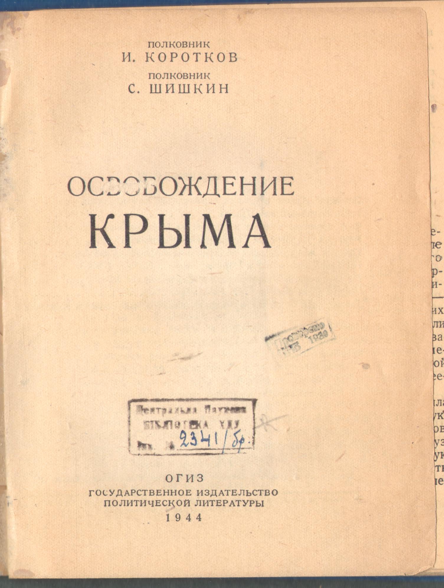 Коротков, Иосиф Степанович. Освобождение Крыма / И. Коротков, С. Шишкин. – Москва: ОГИЗ Государственное издательство политической литературы, 1944. – 48 с.