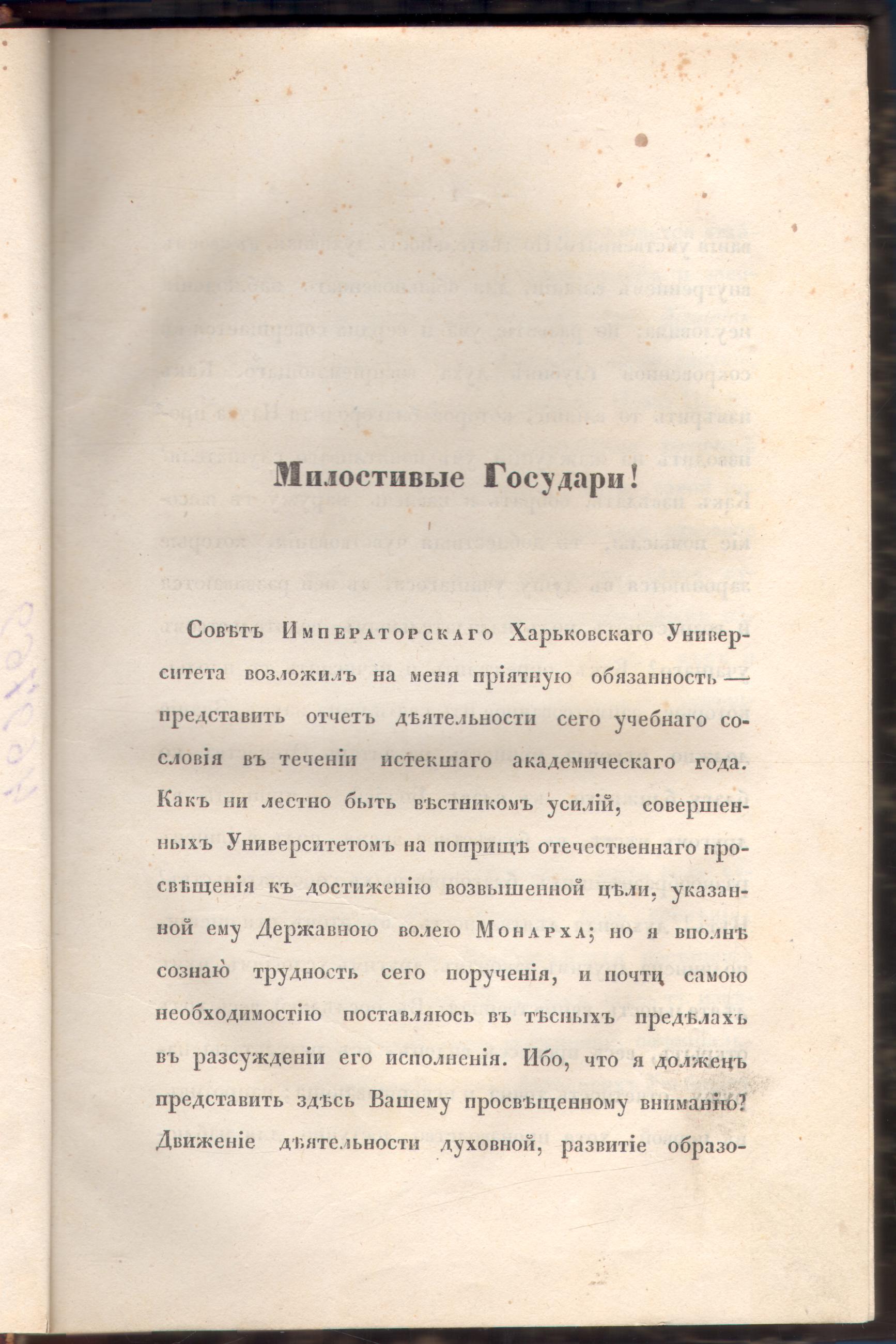 Research Subject Categories::HUMANITIES and RELIGION::History and philosophy subjects::History subjects::History of science, Research Subject Categories::SOCIAL SCIENCES::Social sciences::Education, история Харьковского университета, Kharkov University, the history of Kharkov University, управление университета, отчет за за 1845/46 академический год, сословие учащихся, личный состав по факультетам, должностные занятия членов университета, труды преподавателей, учебно-вспомогательные учреждения Харьковского университета, университетская библиотека, астрономический кабинет, Шидловский Г., профессор астрономии, определение географического положения Харькова, физический кабинет, химическая лаборатория, минералогический кабинет, ботанический сад, зоологический кабинет, технологический кабинет, архитектурный кабинет, нумизматический кабинет, типография университета, Матусевич Г., анатомический кабинет, терапевтическая клиника, хирургическое отделение клиники, акушерская клиника, студенческая больница, практические судебно-медицинские исследования, ветеринарное заведение, зоотомический кабинет, ветеринарная клиника, студент Харьковского университета, приватнослушающие, воспитанники Ветеринарной школы