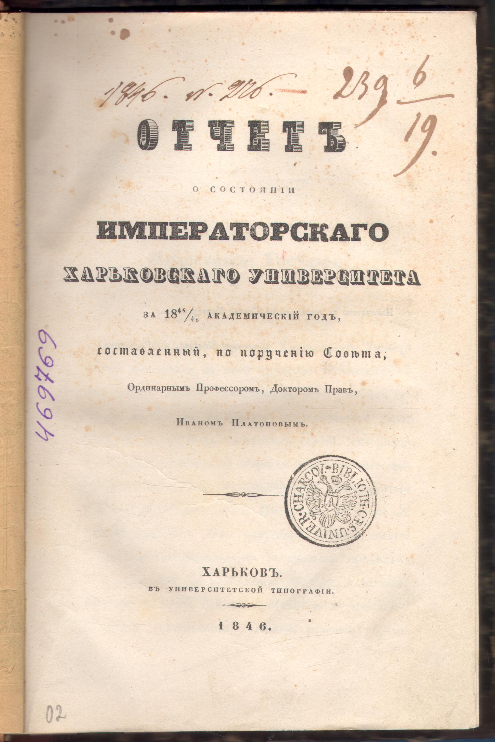 Отчет о состоянии Императорского Харьковского университета за 1845/46 академический год, составленный по поручению Совета, ординарным профессором, доктором прав, Иваном Платоновым
