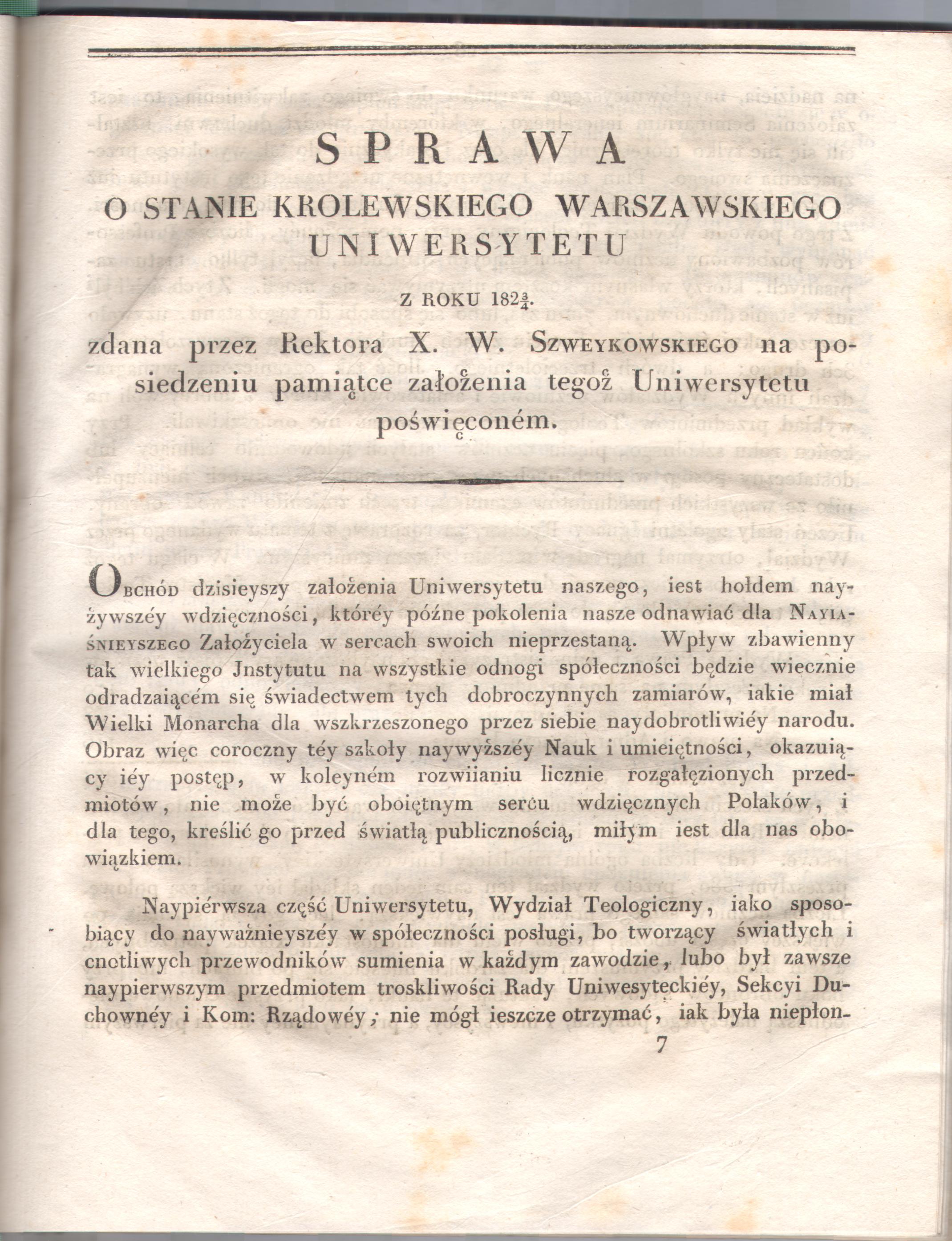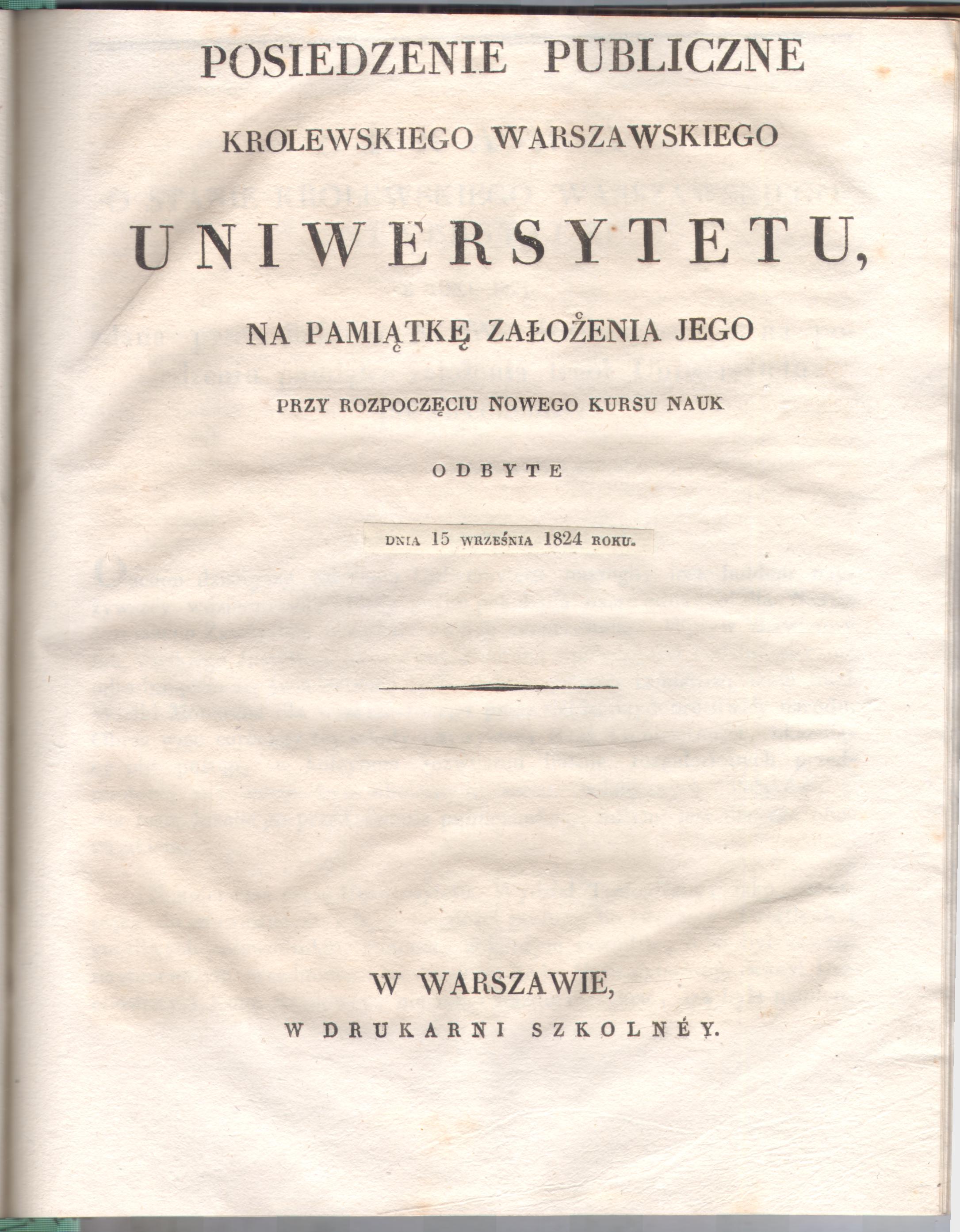 Posiedzenie Publiczne Królewskiego Warszawskiego Uniwersytetu, na Pamiątkę Założenia Iego przy Rozpoczęciu Nowego Kursu Nauk Odbyte dnia 15 września 1824 roku