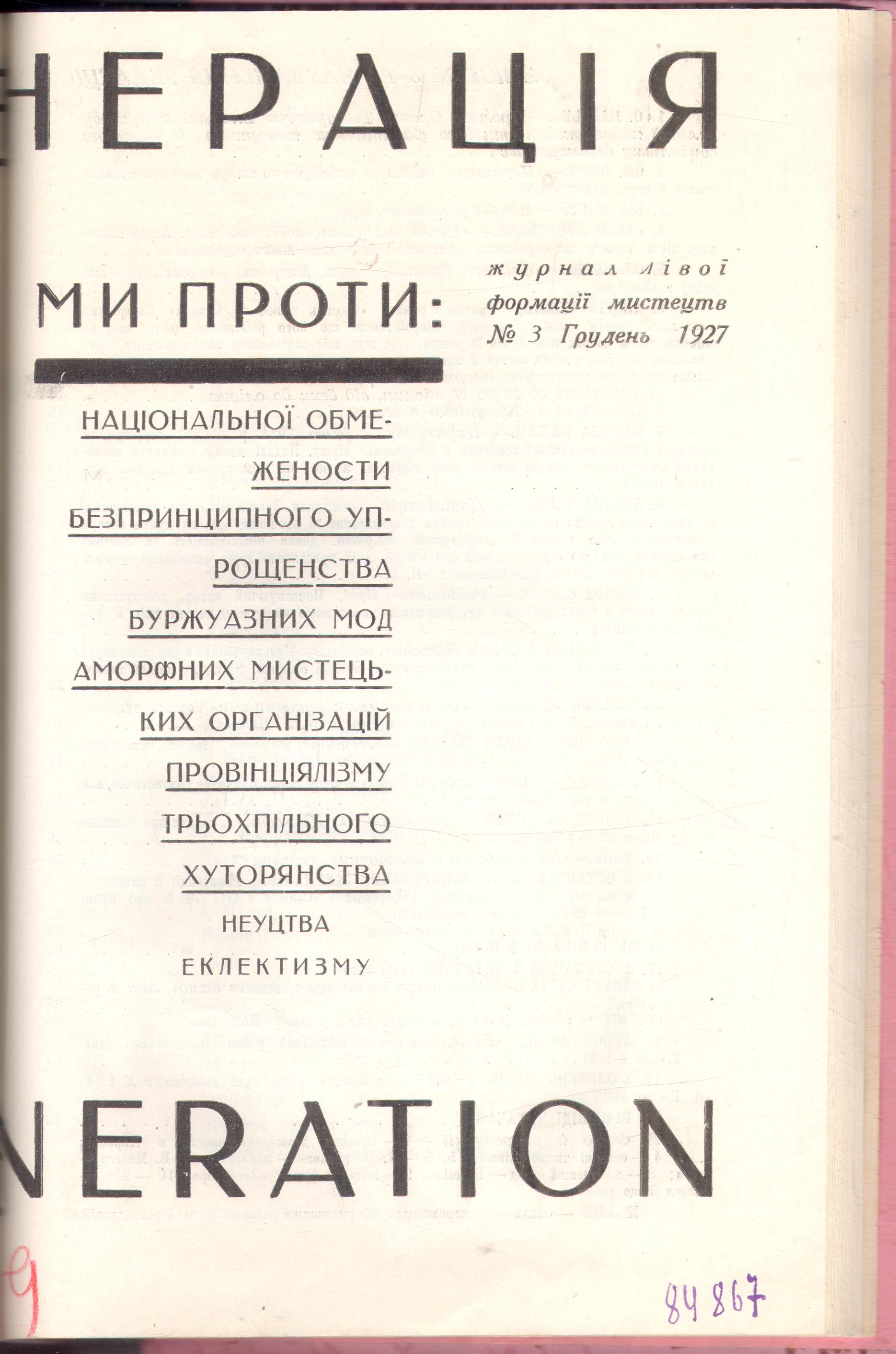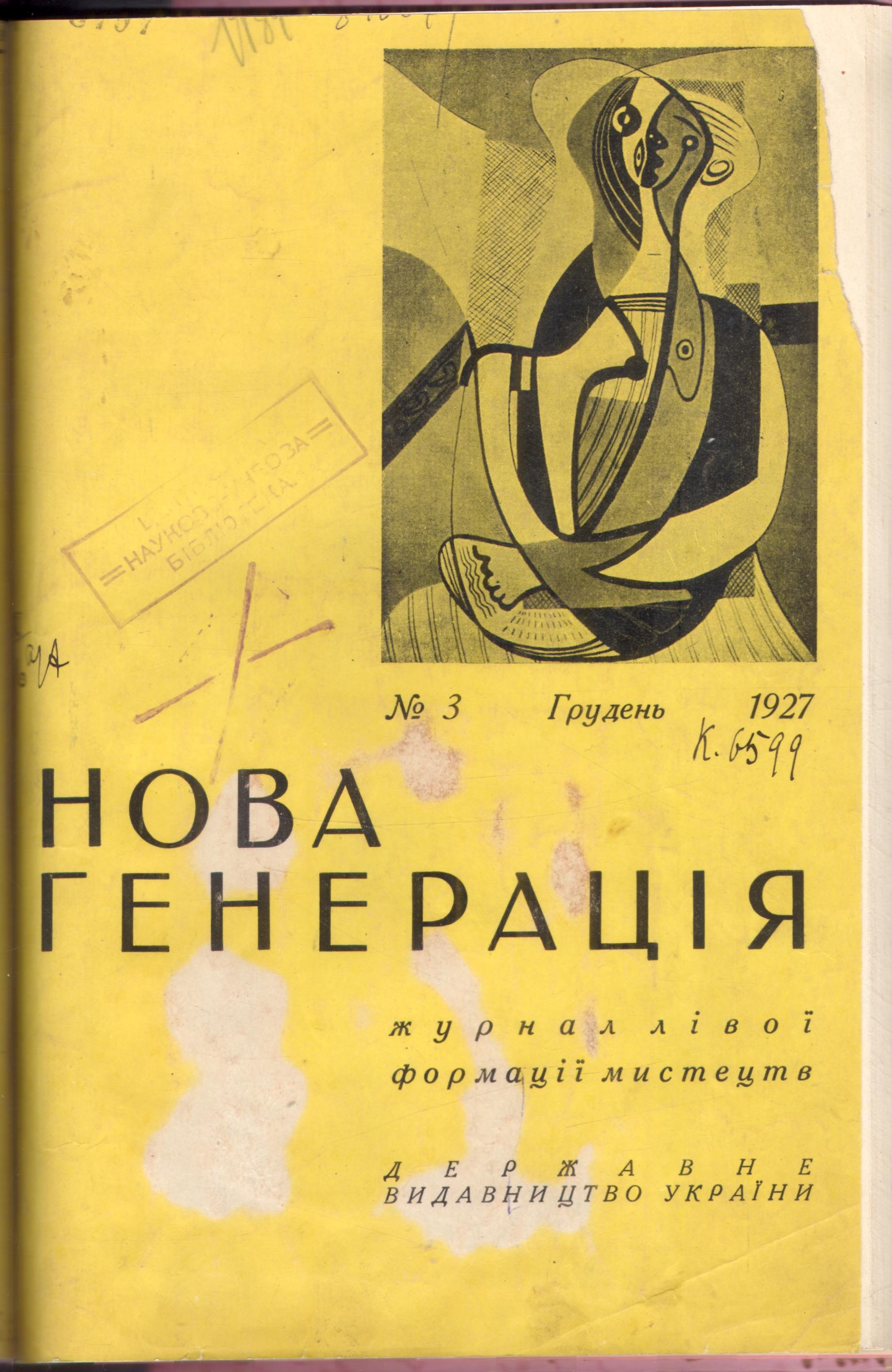 Нова генерація : Журнал лівої формації мистецтв . – Харків : Державне видавництво України, 1927. – № 3 (грудень). – 78 с.; 4 вкл. арк. іл. – (Відсутні С. 23–26, 35–46, 1 вкл. арк. іл.).