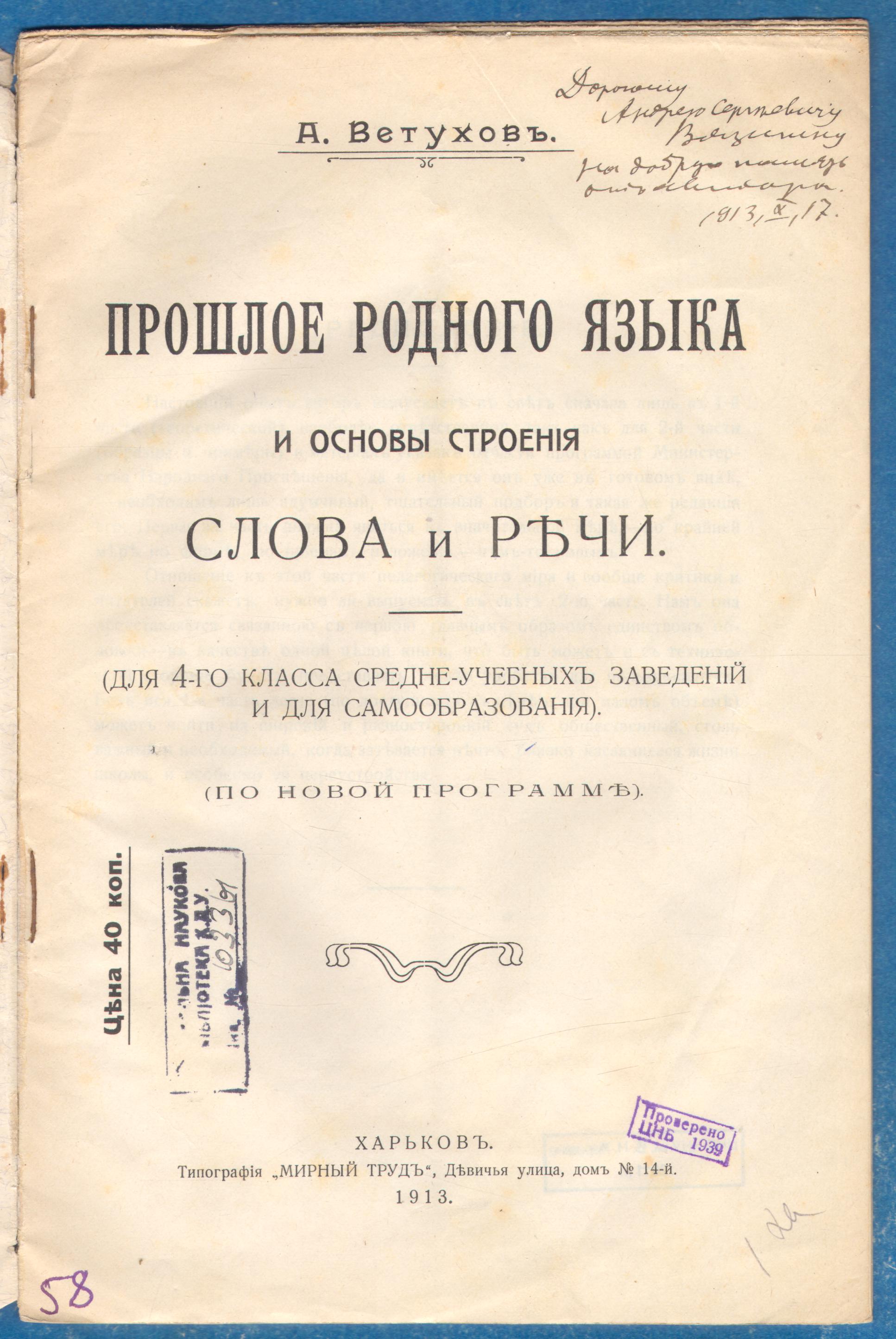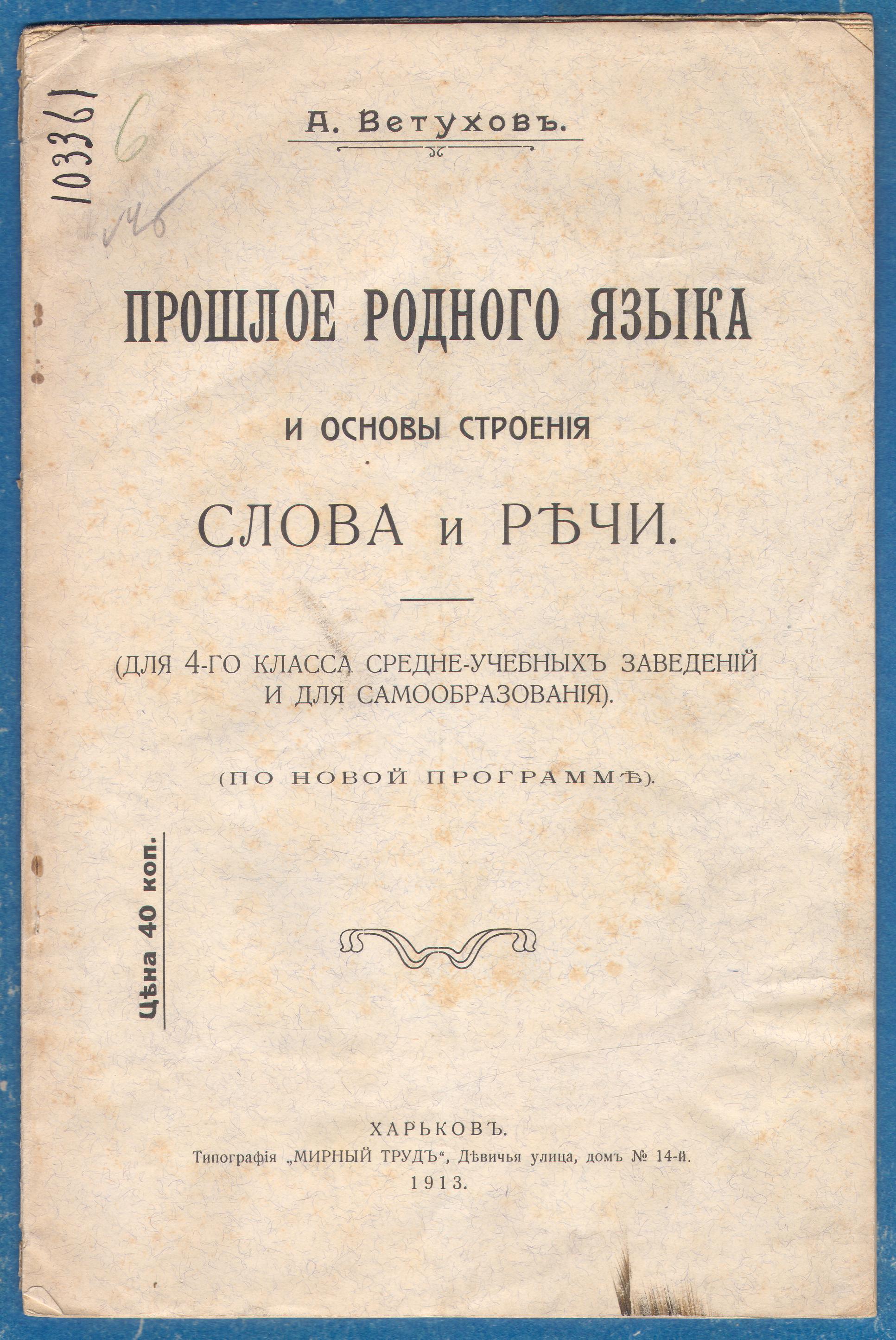 Ветухов, Алексей Васильевич. Прошлое родного языка и основы строения слова и речи: Для 4-го класса средне-учебных заведений и для самообразования / А.В. Ветухов. – Харьков: Типография «Мирный труд», 1913. – 31 с. – (С автографом автора).
