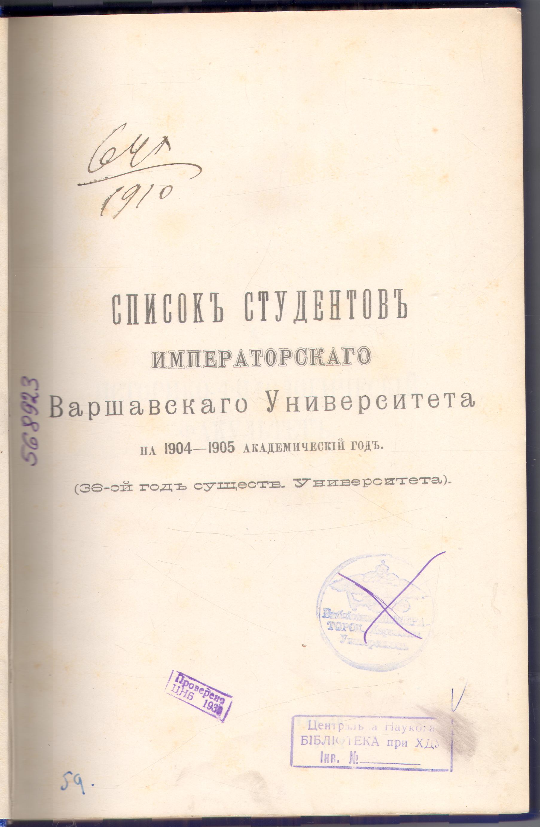 | dc.identifier.citation | Варшавский Императорский университет. Список студентов Императорского Варшавского университета на 1904–1905 академический год (36-ой год существования Университета). – Варшава : Типография Варшавского Учебного Округа, [1905]. – 208 с. | ru_RU |