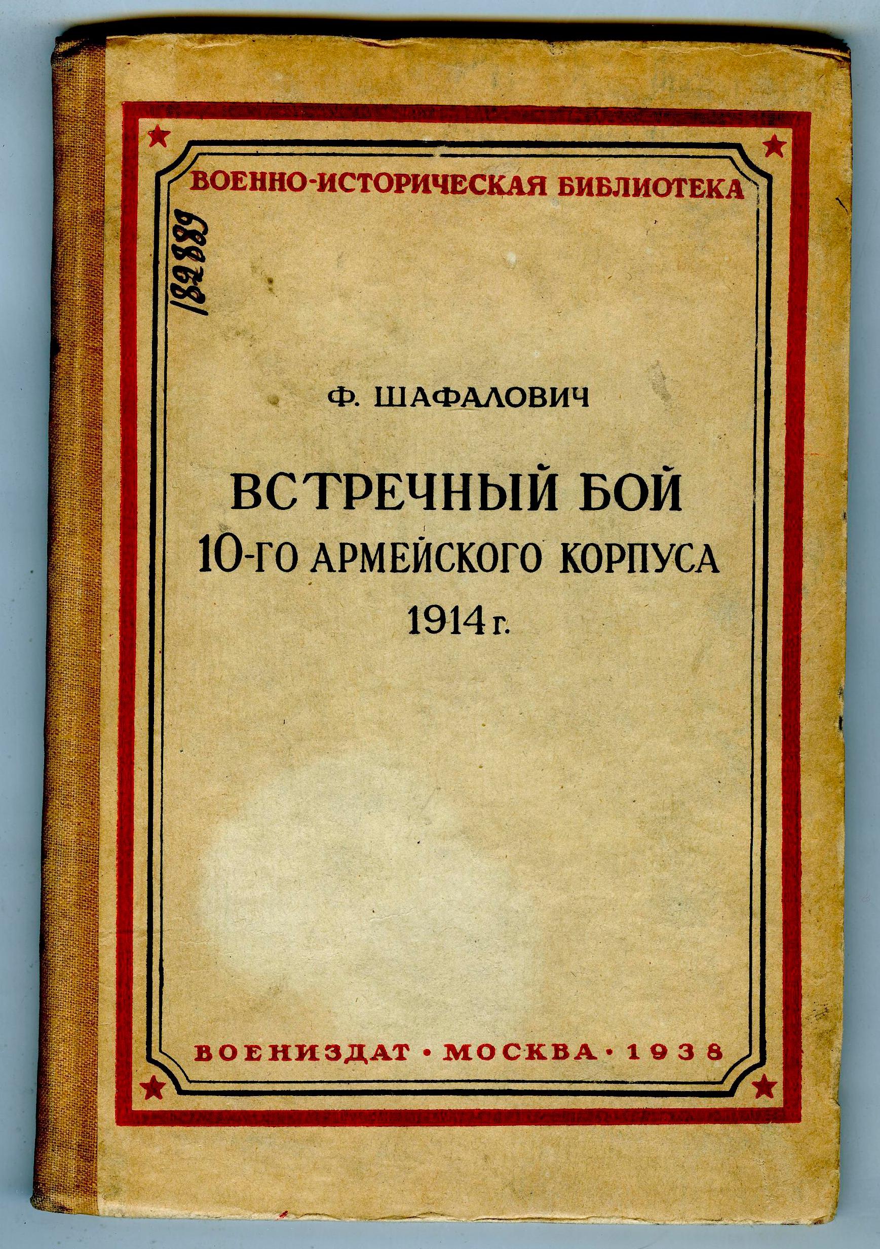 Шафалович, Федор Платонович. Встречный бой 10-го армейского корпуса на р. Золотой липе 26–29 августа 1914 г. / Ф.П. Шафалович. – Москва: Государственное военное издательство Наркомата обороны Союза ССР, 1938. – 123 с. со схемами.