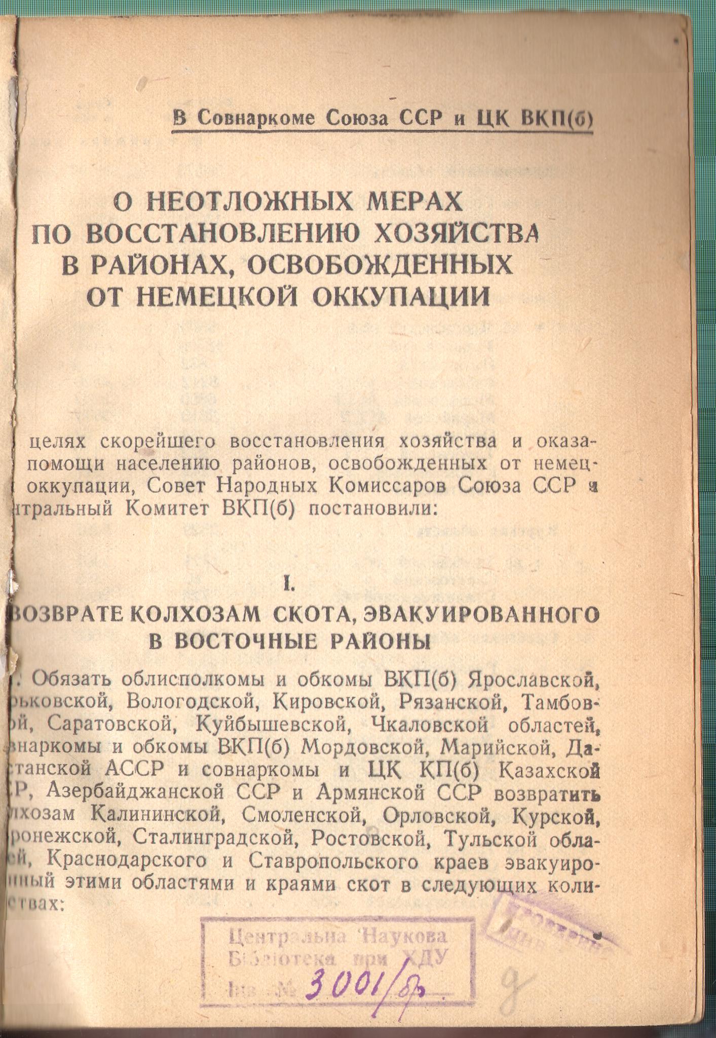 О неотложных мерах по восстановлению хозяйства в районах, освобожденных от немецкой оккупации. – Москва: ОГИЗ Госполитиздат, 1943. – 63 с.