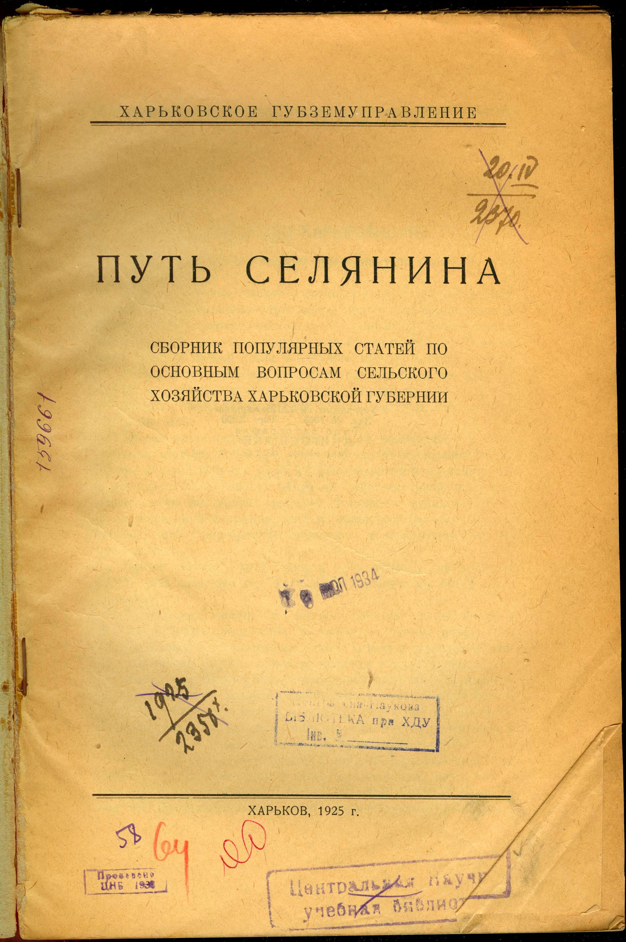 Путь селянина : сборник популярных статей по основным вопросам сельского хозяйства Харьковской губернии / Харьковское губземуправление . – Харьков: Типо-литография «Книгоспілки» , 1925 . – 150 с.
