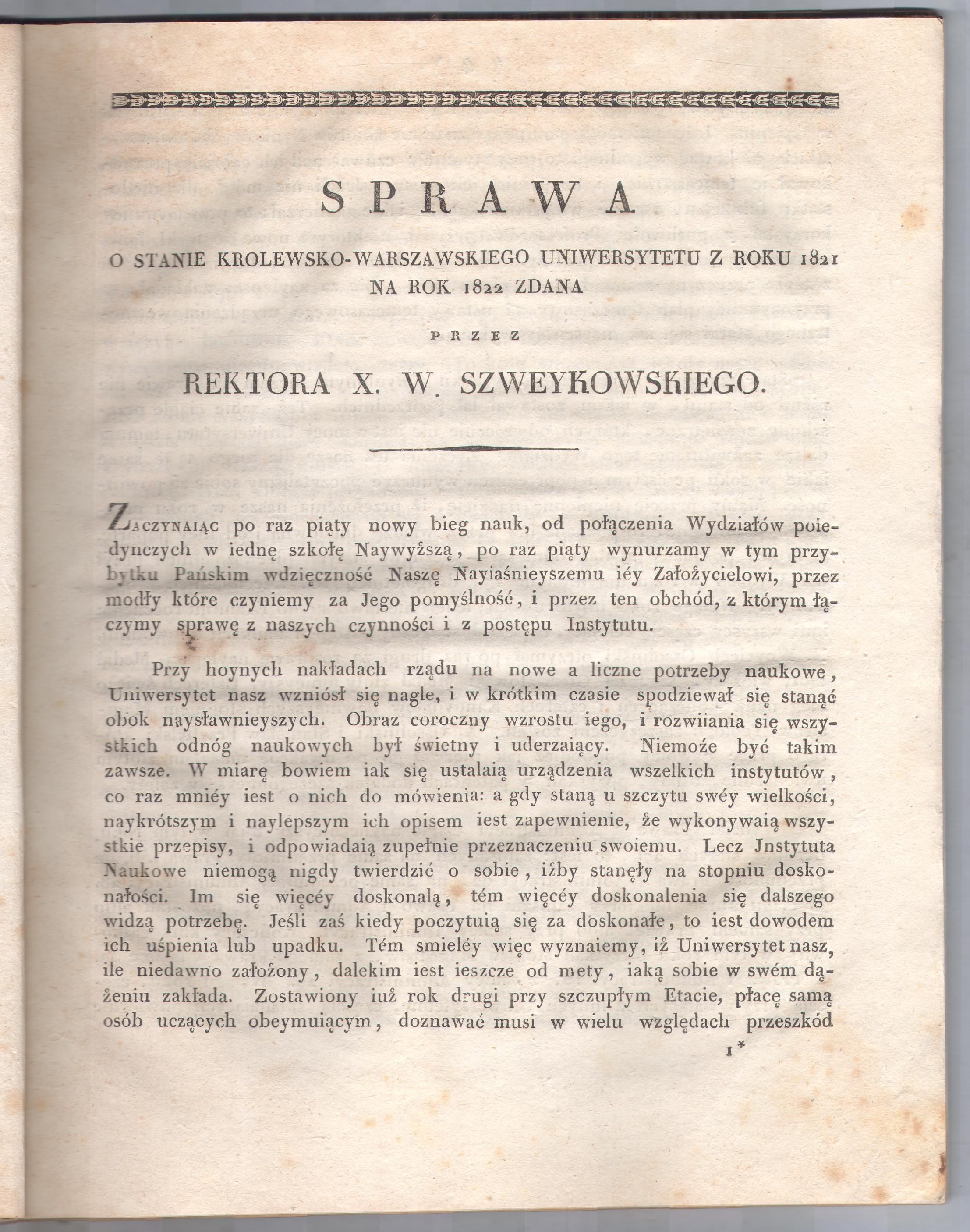 Królewski Uniwersytet Warszawski. Posiedzenie Publiczne Królewsko-Warszawskiego Uniwersytetu, na Pamiątkę Założenia Iego przy Rozpoczęciu Nowego Kursu Nauk Odbyte dnia 3 pazdziernika 1822 roku. – Warszawa : w Drukarni N. Glücksberga, 1822. – 45 с. ; 1 вкл. арк. іл.