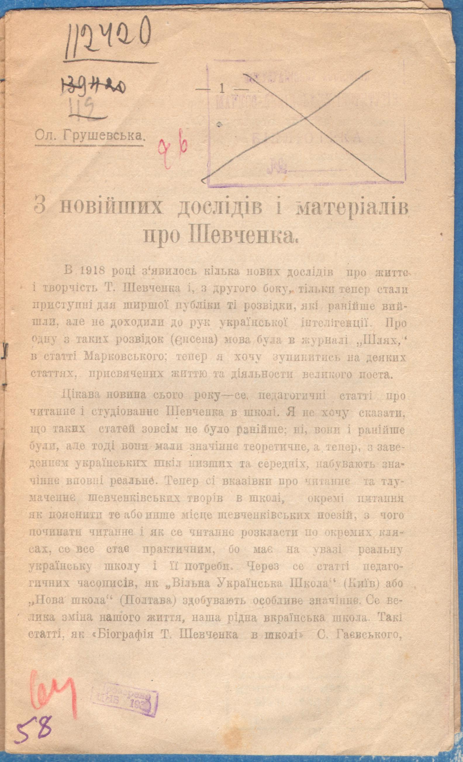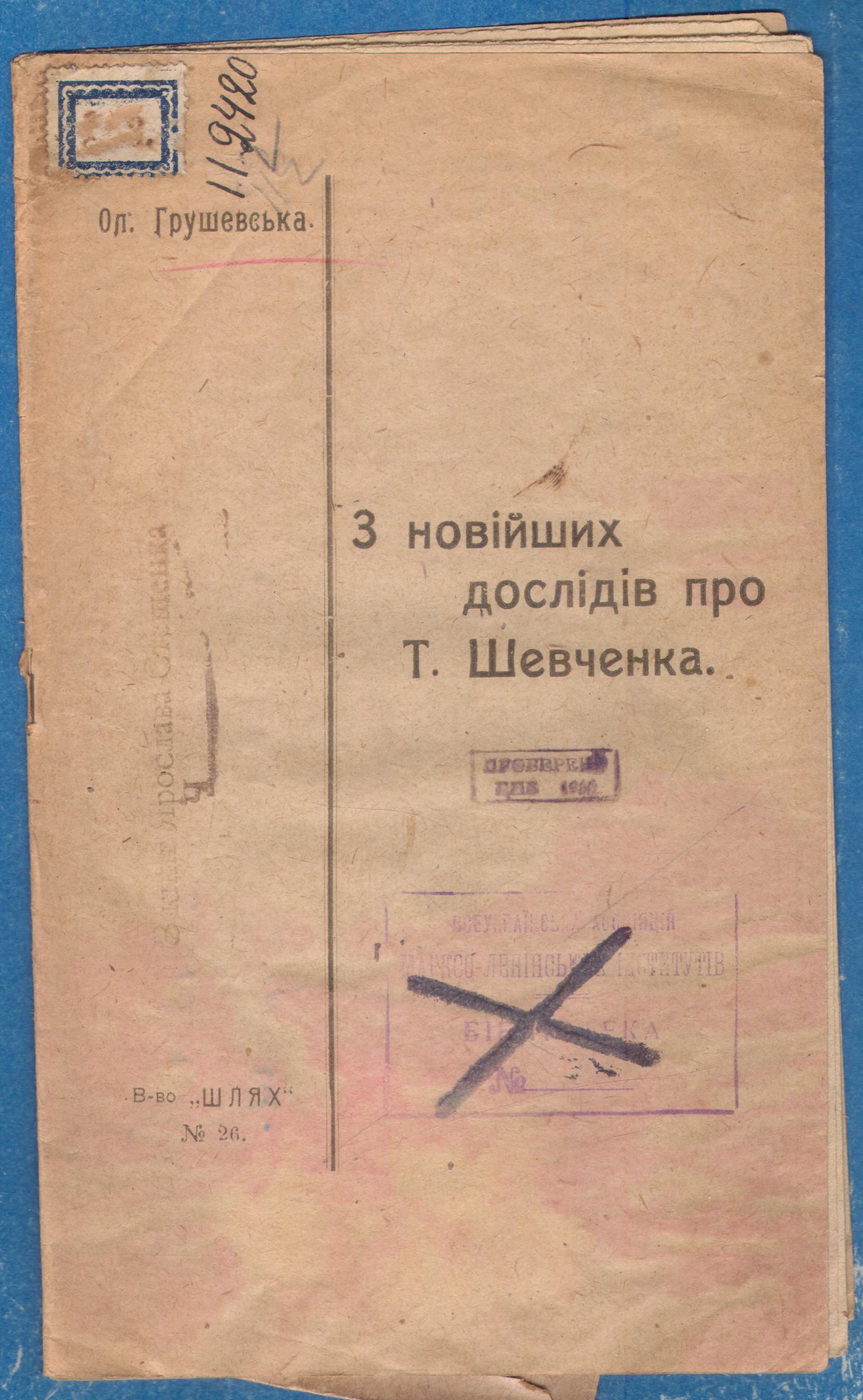 Грушевська, Ольга Олександрівна. З новійших дослідів про Т. Шевченка / О.О. Грушевська. – [Київ]: Видавництво «Шлях», [1918]. – 12 с. – (В-во «Шлях» № 26.)