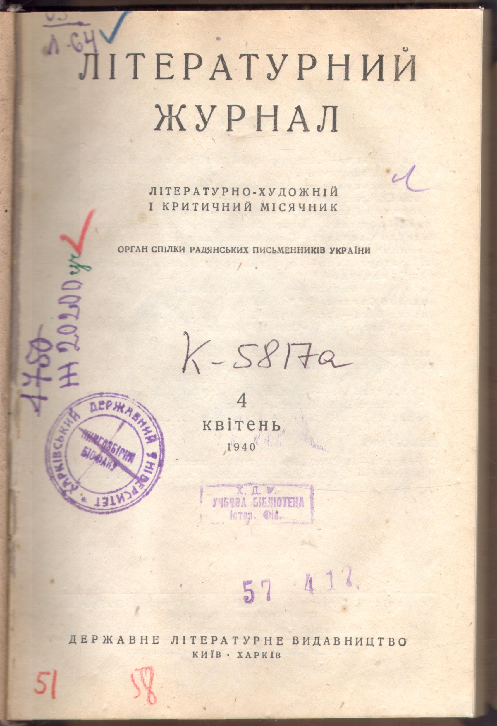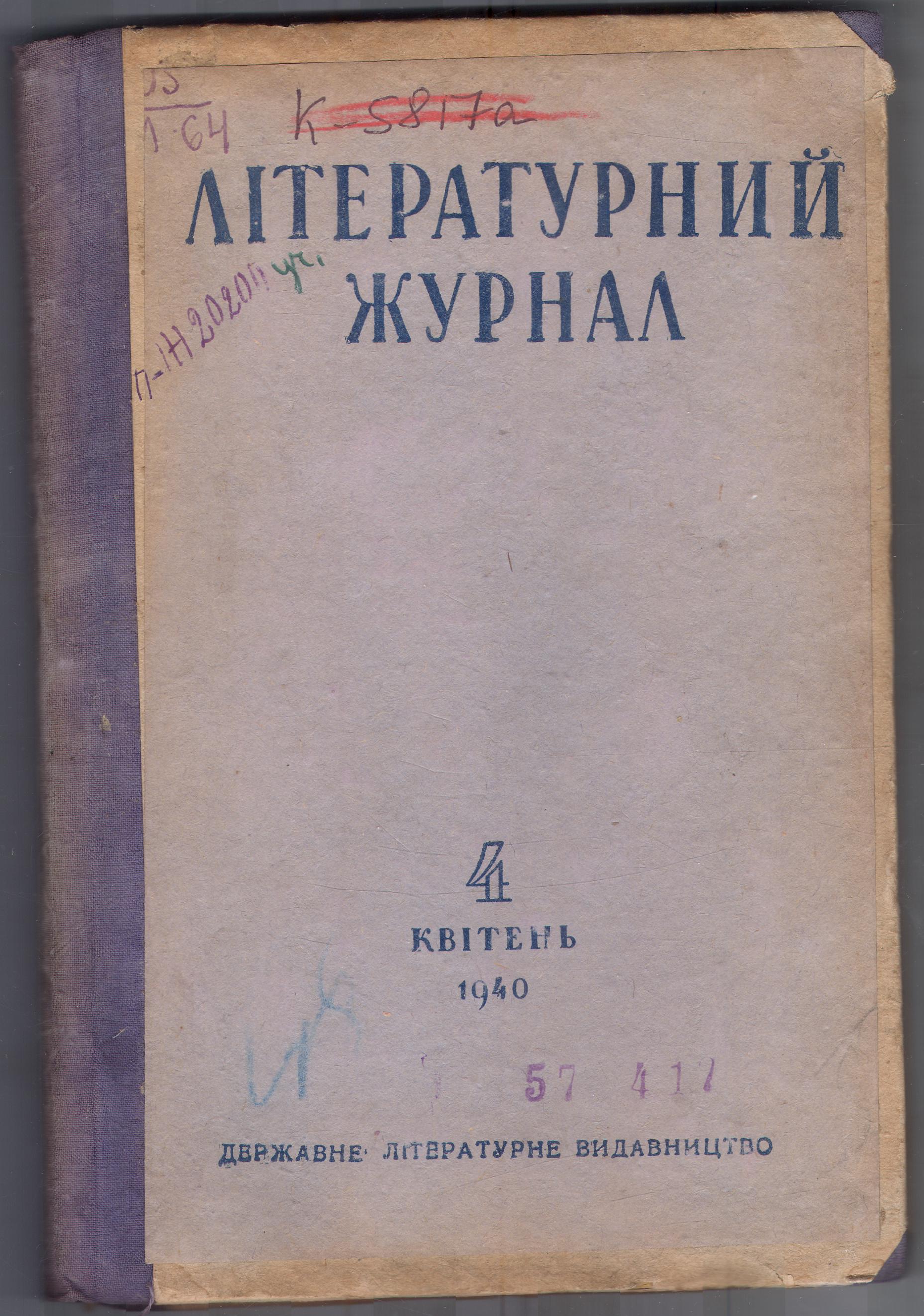 Літературний журнал : літературно-художній і критичний місячник . – Київ ; Харків : Державне літературне видавництво , 1940 . – № 4 (квітень). – 128 с.
