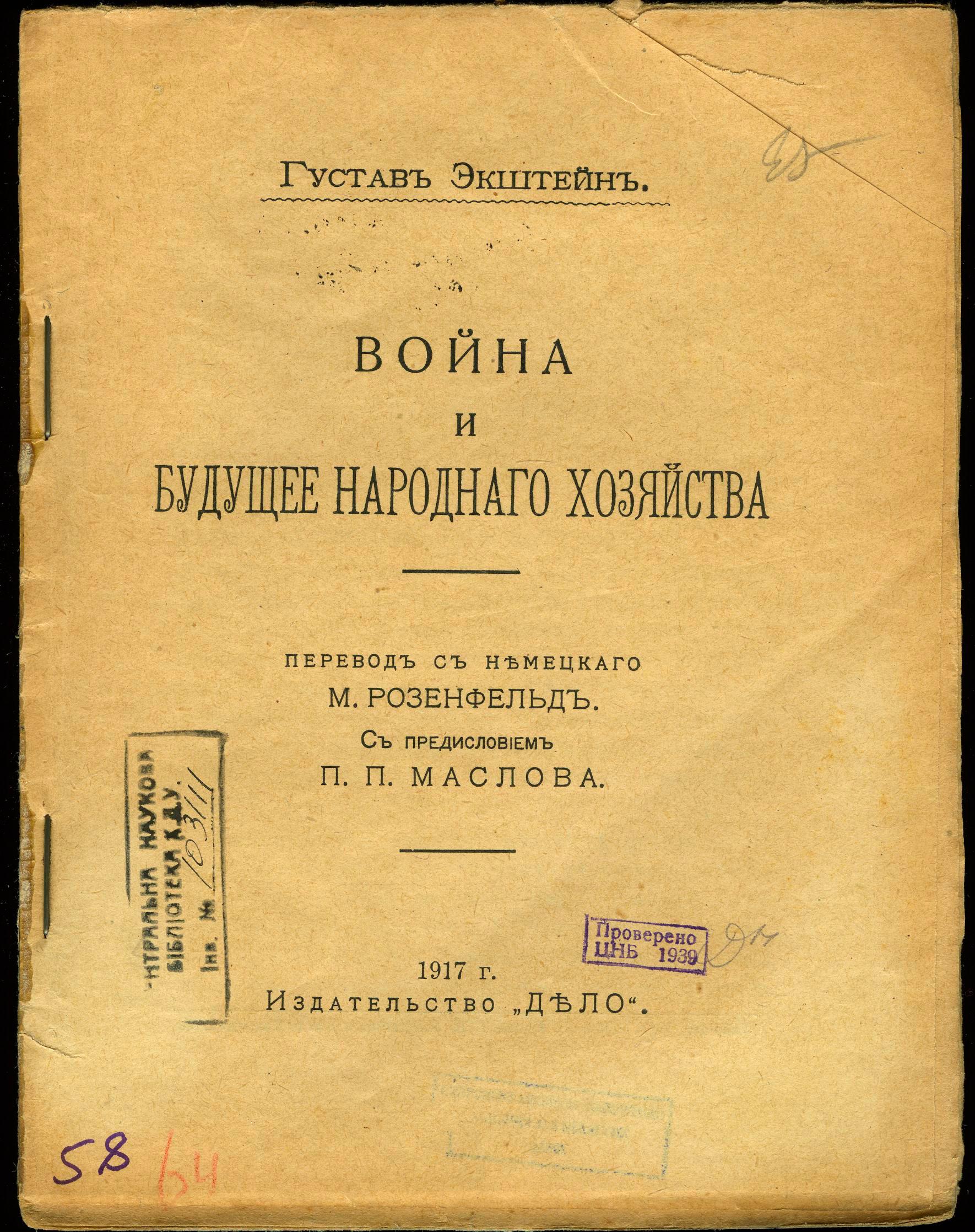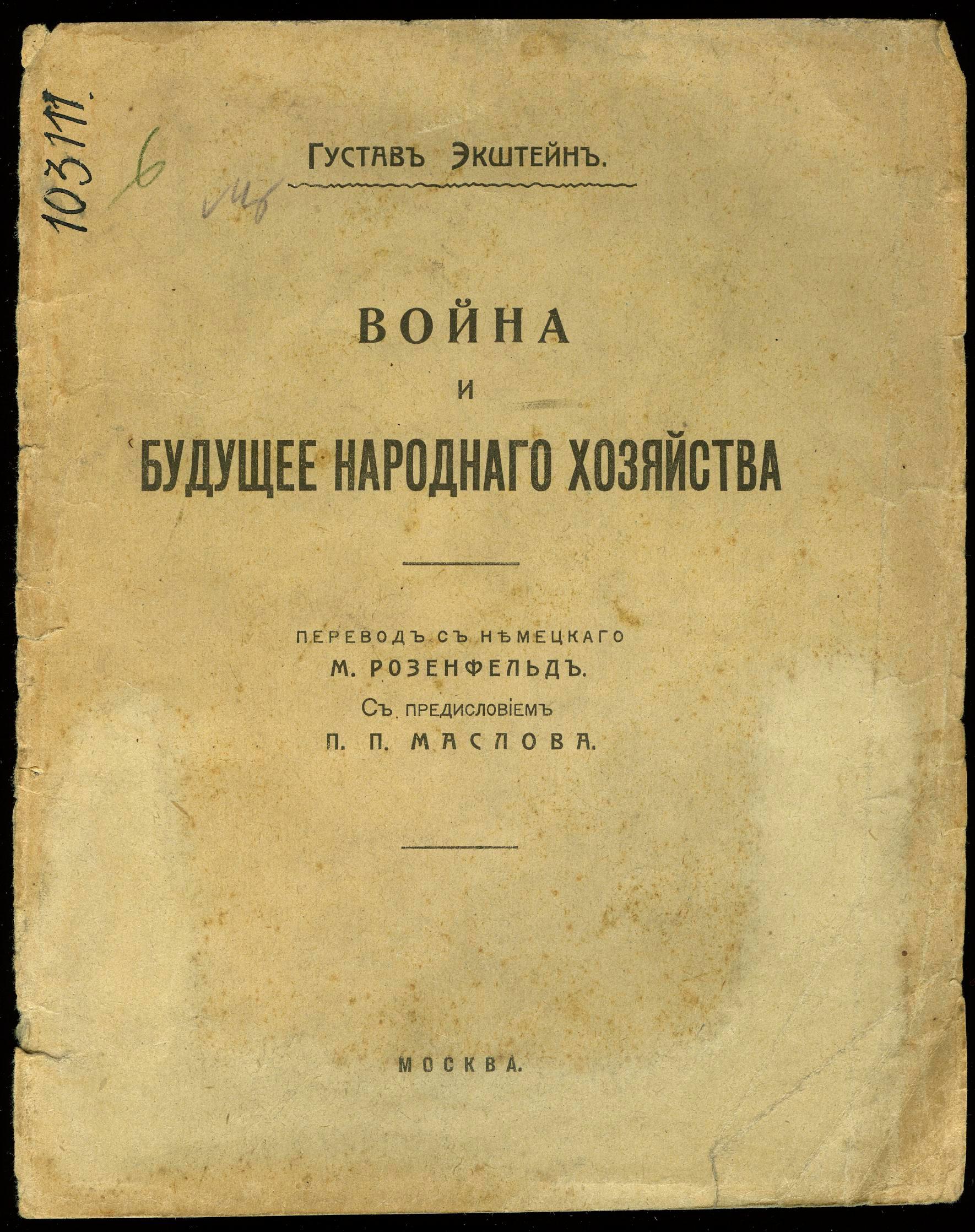 Экштейн Густав. Война и будущее народного хозяйства / Г. Экштейн; пер. с нем. М. Розенфельд, с предисл. П.П. Маслова. – Москва: Дело, 1917. – XII, 50 с.