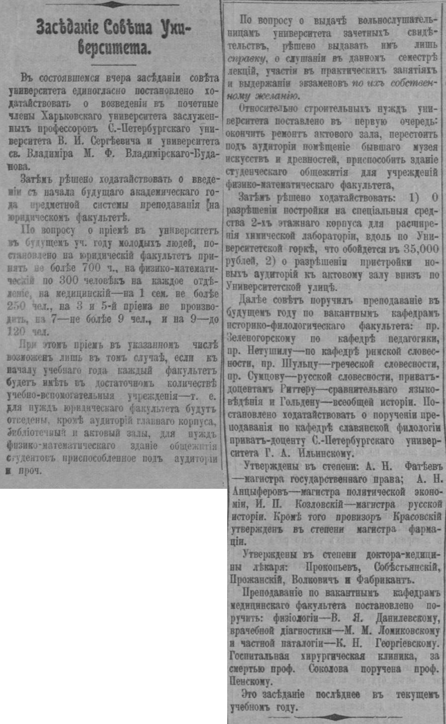 Заседание Совета Университета // Утро : политическая, общественная, литературная и экономическая газета. 1907, 25 мая (№ 146). – Харьков, 1907. – С. 4.