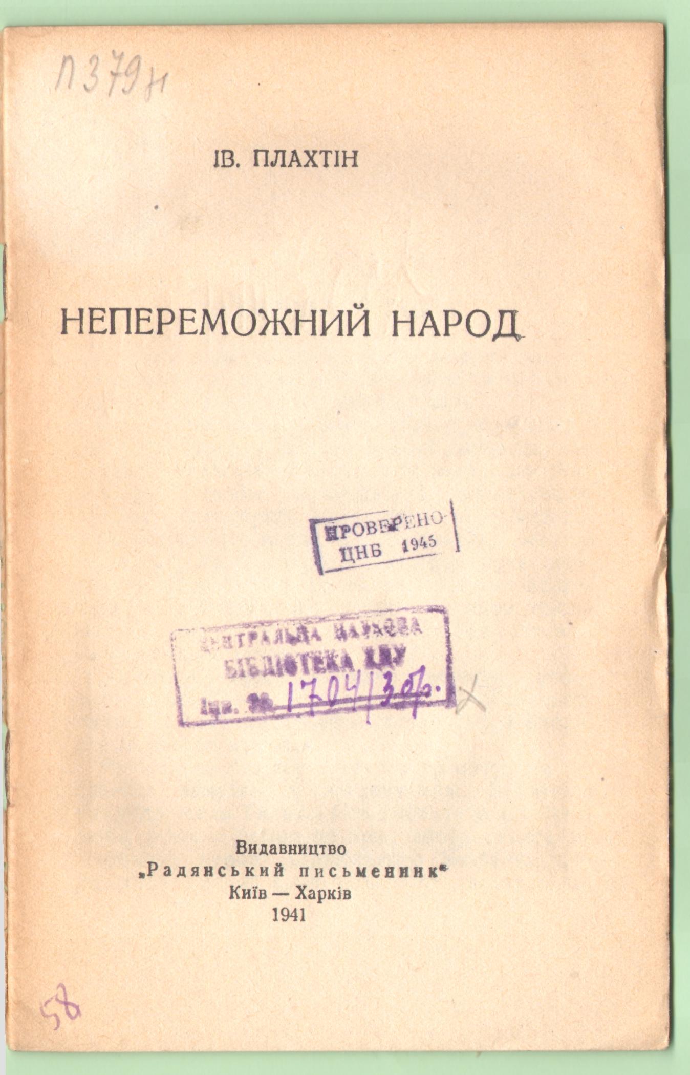 Плахтін, Іван Олексійович. Непереможний народ / І.О. Плахтін. – Київ; Харків: Радянський письменник, 1941. – 19 с.