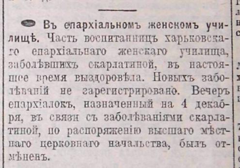 В епархиальном женском училище [скарлатина] // Утро : политическая, общественная, литературная и экономическая газета. 1912, 6 декабря (№ 1818). – Харьков, 1912. – С. 6.