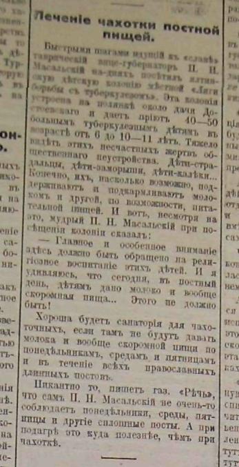 Лечение чахотки постной пищей // Утро : политическая, общественная, литературная и экономическая газета. 1912, 1 сентября (№ 1739). – Харьков, 1912. – С. 3.