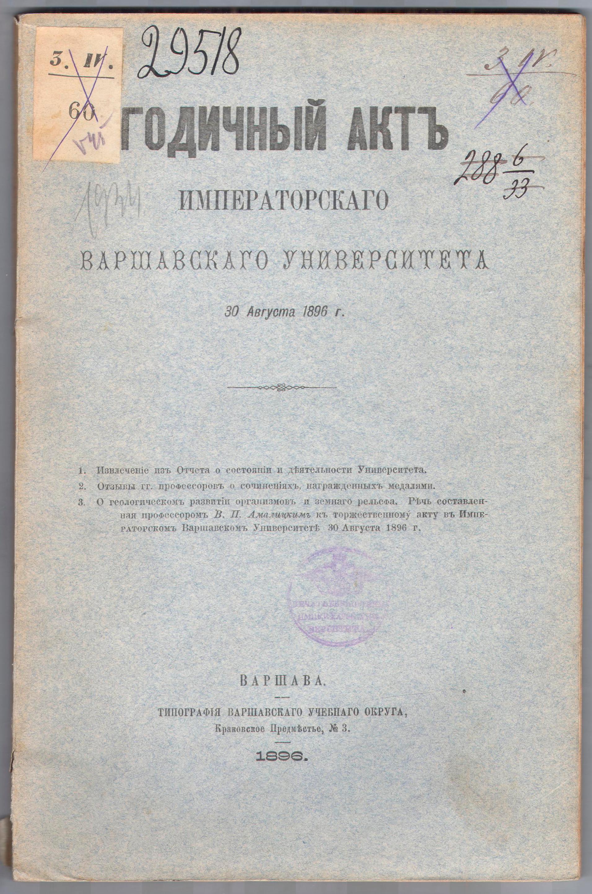 Варшавский Императорский университет. Годичный акт Императорского Варшавского университета 30 августа 1896 года. – Варшава : Типография Варшавского Учебного Округа, 1896. – 95, 31 с.
