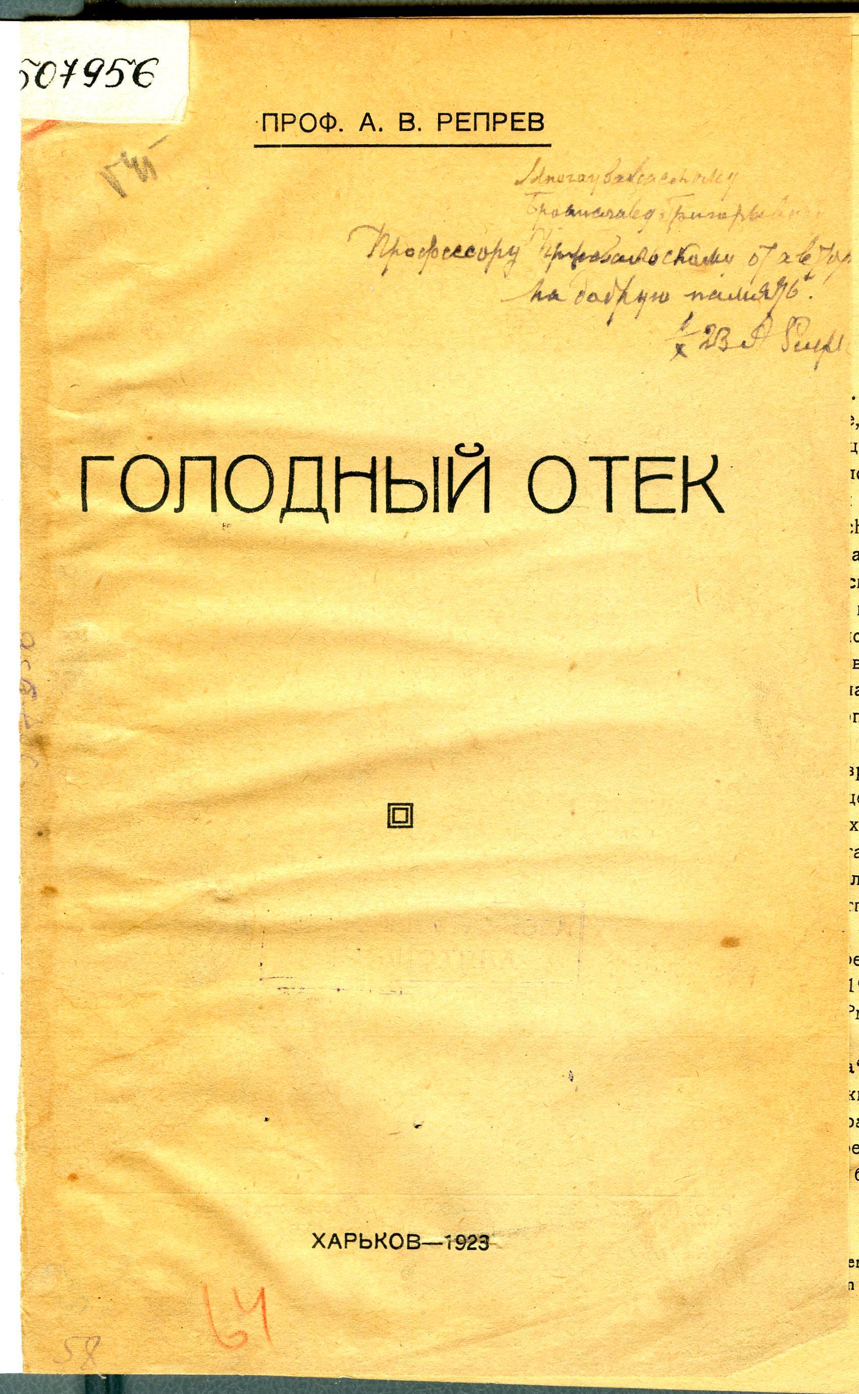 Репрев, Александр Васильевич. Голодный отёк / проф. А.В. Репрев. – Харьков: Б.и., 1923. – 59 с. ; 1 вл. л. график.