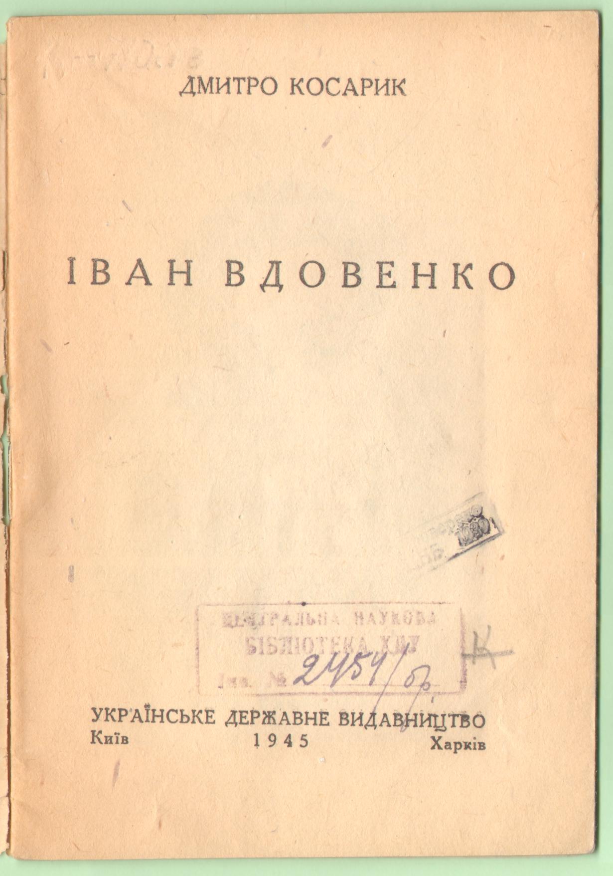 Косарик, Дмитро Михайлович. Іван Вдовенко / Д.М. Косарик. – Київ; Харків: Українське Державне видавництво, 1945. – 16 с. : портр.