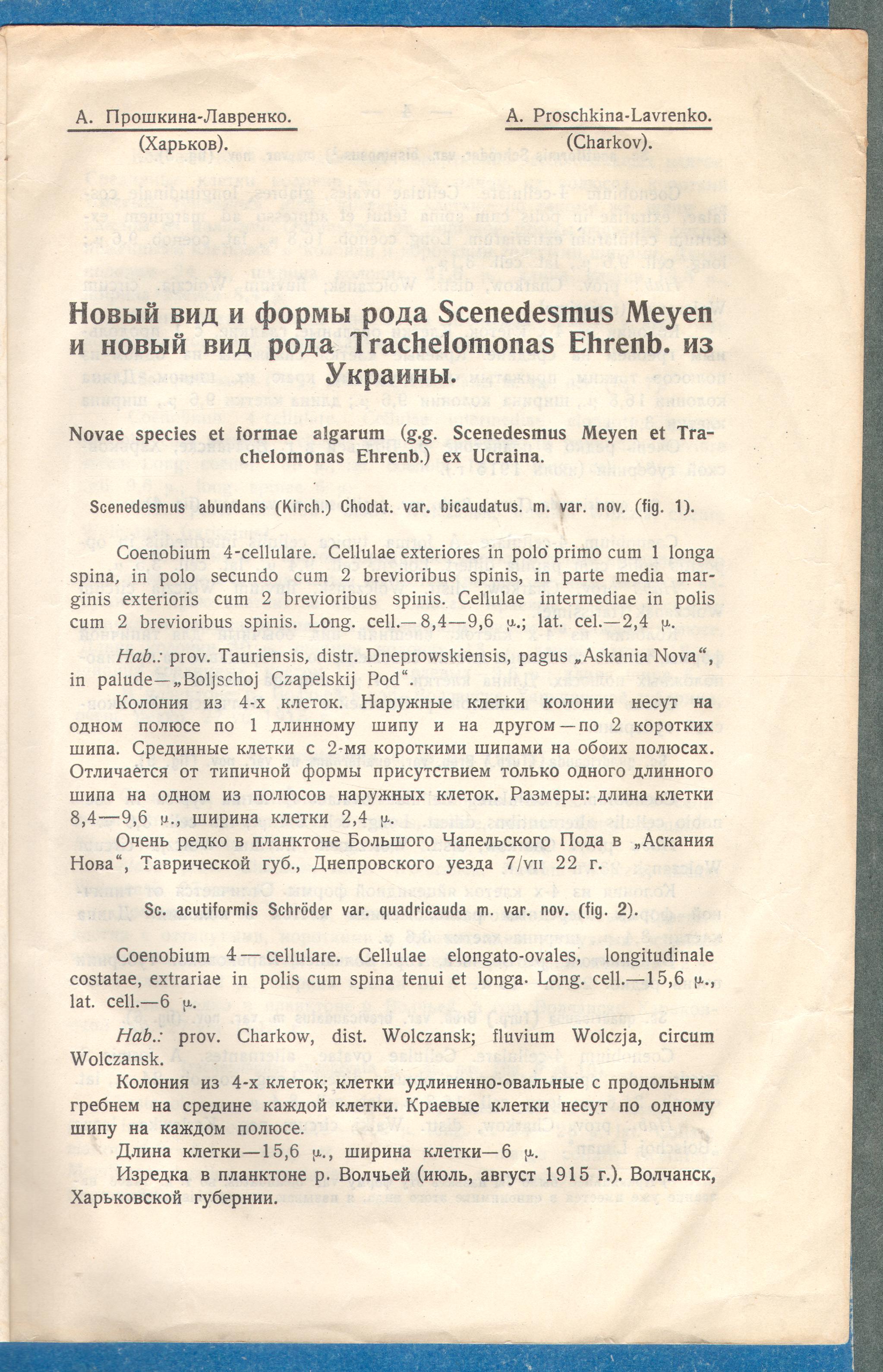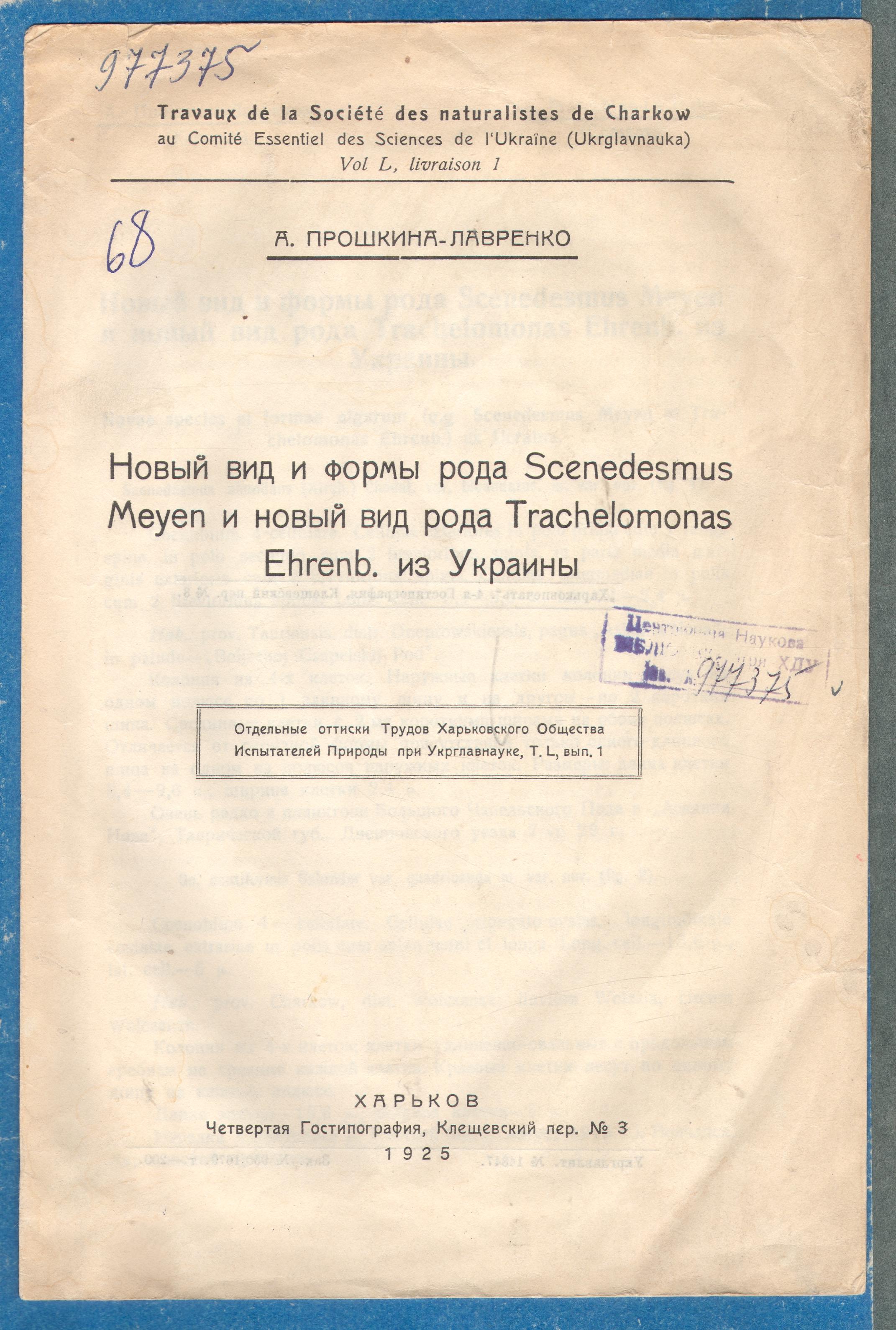 Прошкина-Лавренко, Анастасия Ивановна. Новый вид и формы рода Scenedesmus Meyen и новый вид рода Trachelomonas Ehrenb. из Украины / А.И. Прошкина-Лавренко. – Харьков: Четвертая гостипография, 1925. – 6 с. – Отдельные оттиски Трудов Харьковского общества испытателей природы при Укрглавнауке, Т. L, вып.1.