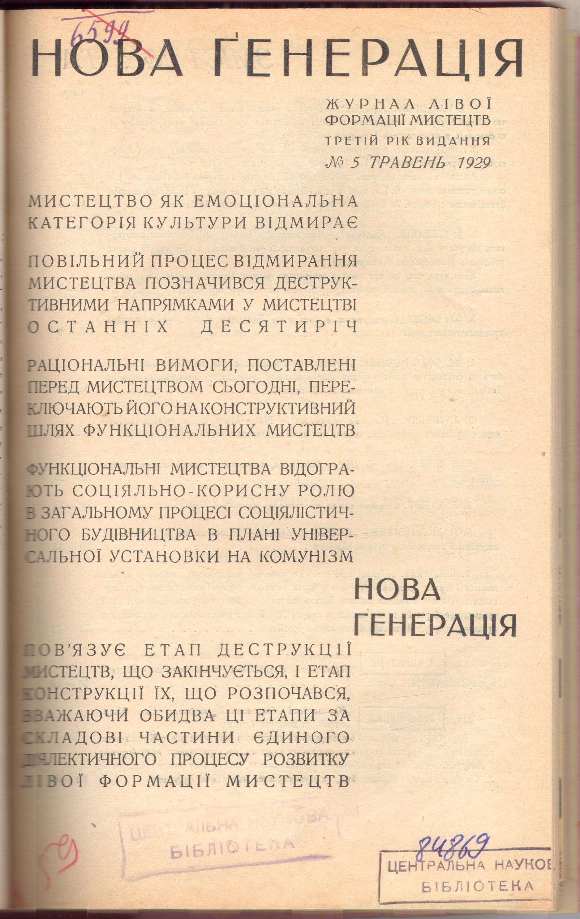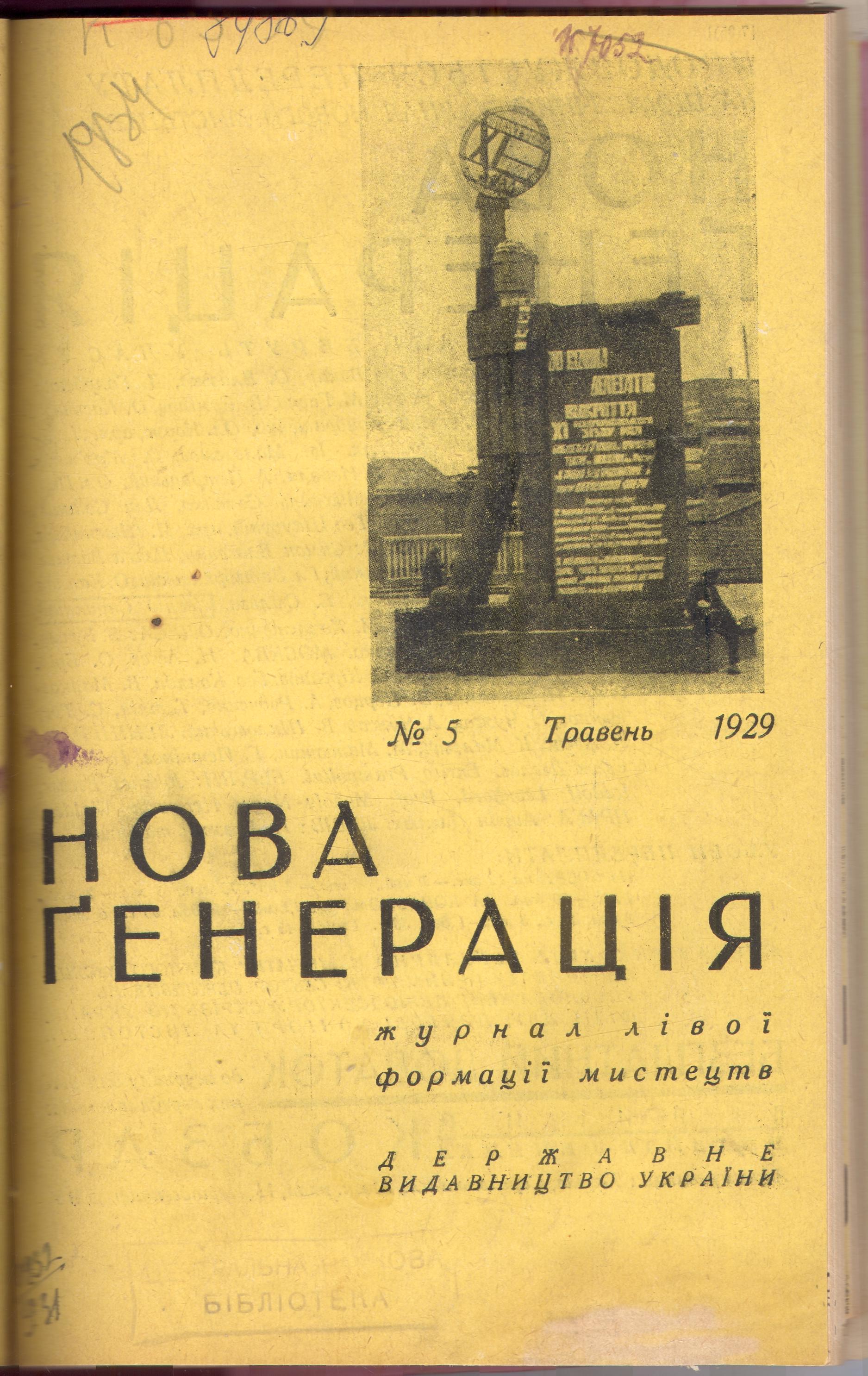 Нова генерація : Журнал лівої формації мистецтв . – Харків : Державне видавництво України, 1929. – № 5 (травень). – [76] с. ; 8 вкл. арк. іл. – (Відсутні С. 33–48, 57–68,77–…, без останніх сторінок).