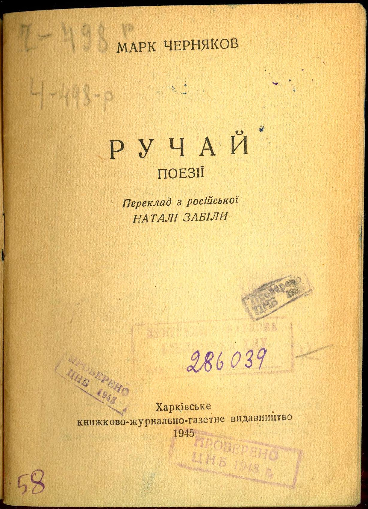 Черняков, Марк. Ручай: поезії / М. Черняков; переклад з російської Наталі Забіли. – Харків: Харківське книжково-журнально-газетне видавництво, 1945. – 32 с.