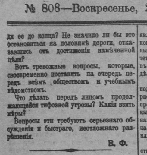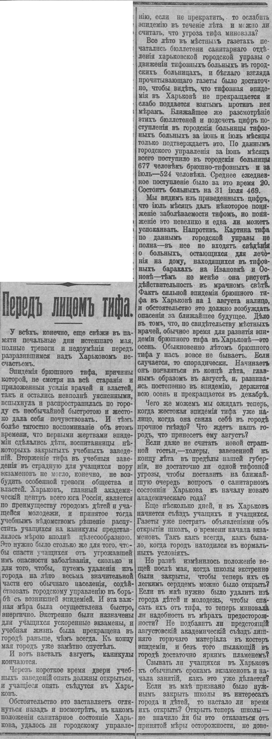 Перед лицом тифа // Утро : политическая, общественная, литературная и экономическая газета. 1909, 2 августа (№ 808). – Харьков, 1909. – С. 4-5.