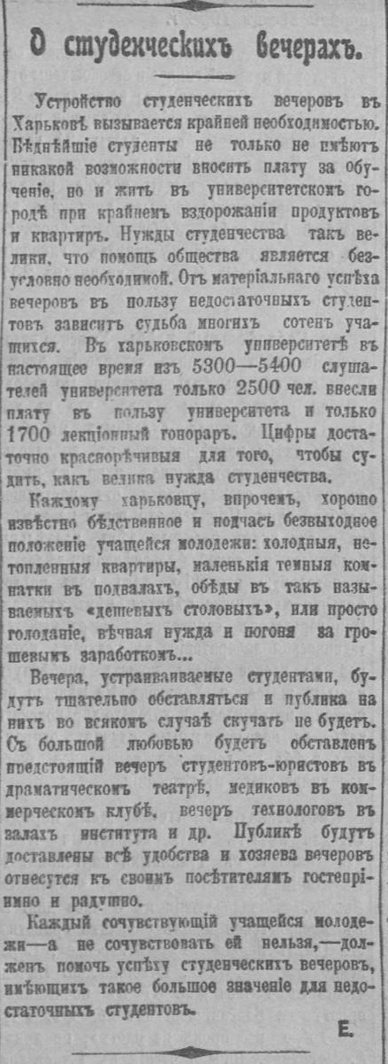 О студенческих вечерах // Утро : политическая, общественная, литературная и экономическая газета. 1907, 4 ноября (№ 281). – Харьков, 1907. – С. 5.