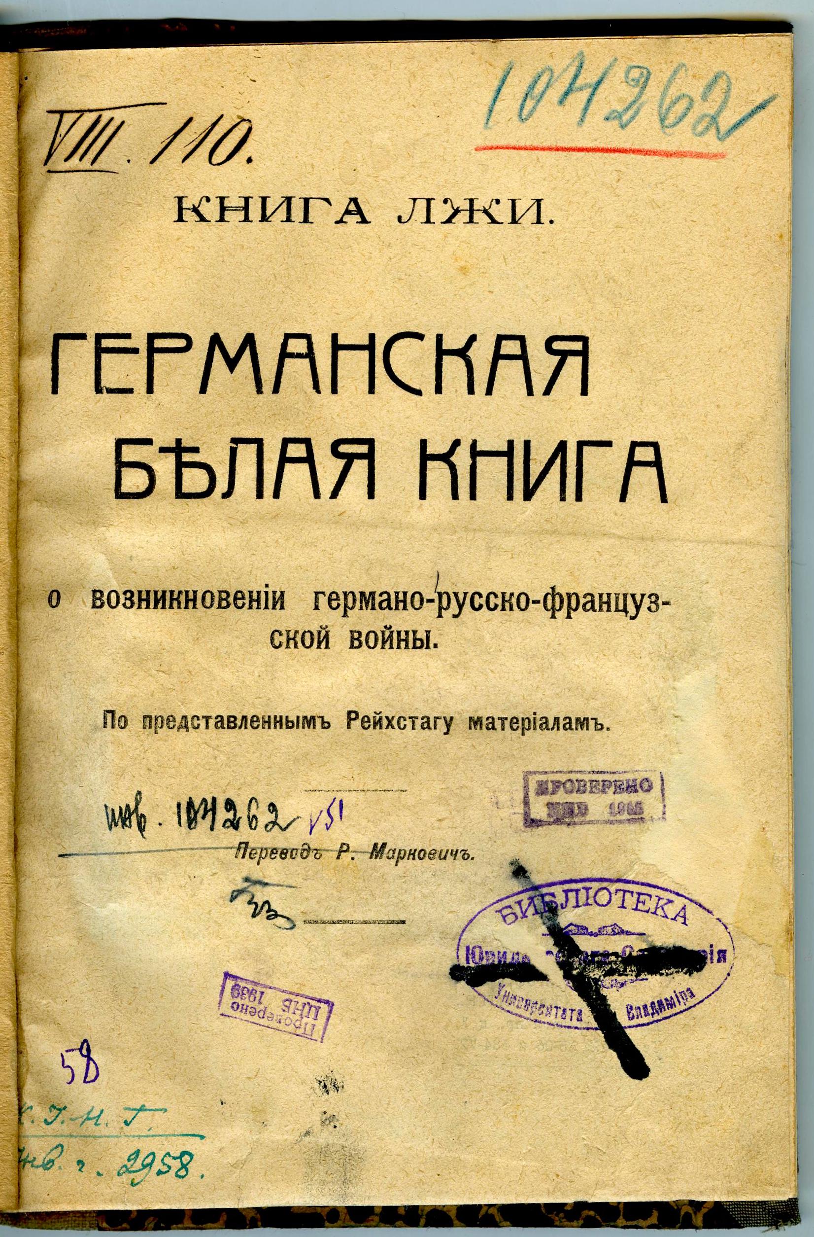 Германская белая книга о возникновении германо-русско-французской войны : По представленным Рейхстагу материалам : Книга лжи / пер. [с нем.] Р.М. Маркович. – [Пг. : Тип. т-ва «Екатерингофское печатное дело», 1915]. – 63 с.