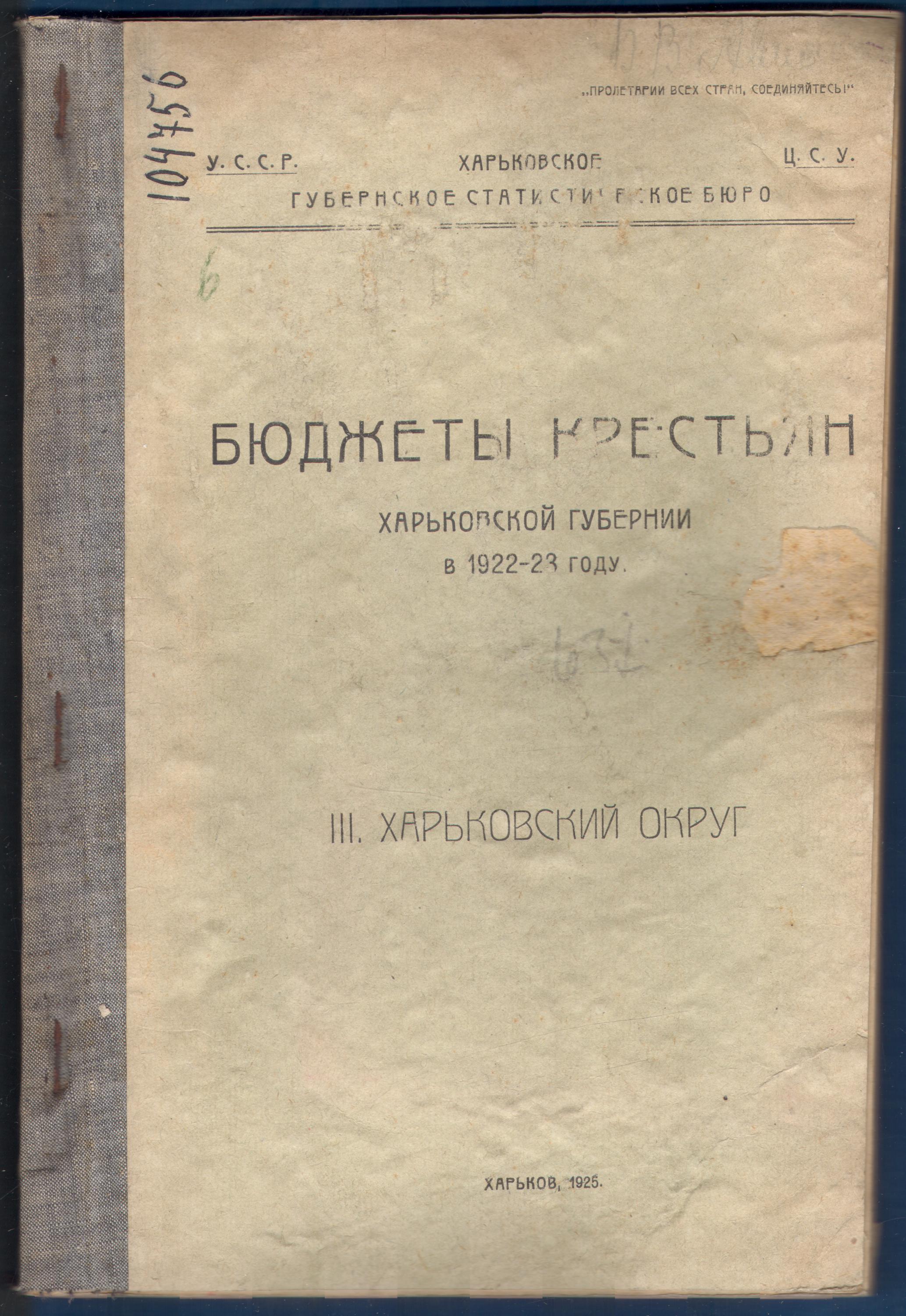 Бюджеты крестьян Харьковской губернии в 1922–1923 году. Ч.3. Харьковский округ / Харьковское губернское статистическое бюро, ЦСУ УССР. – Харьков, 1925. – 2, V, 82 с. : 64 с. табл.