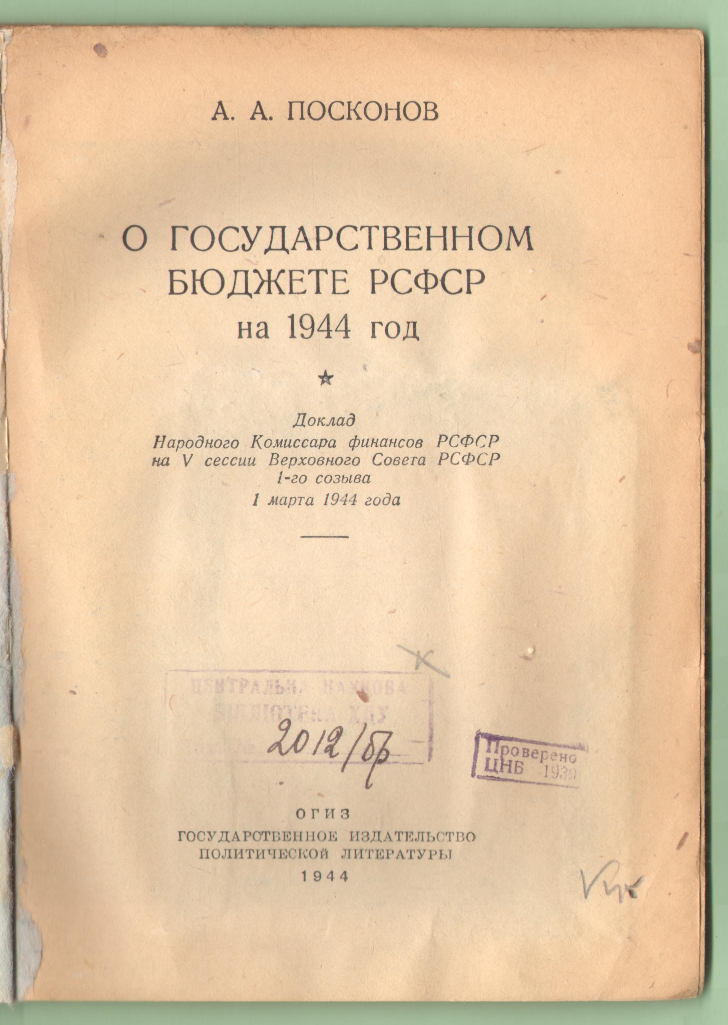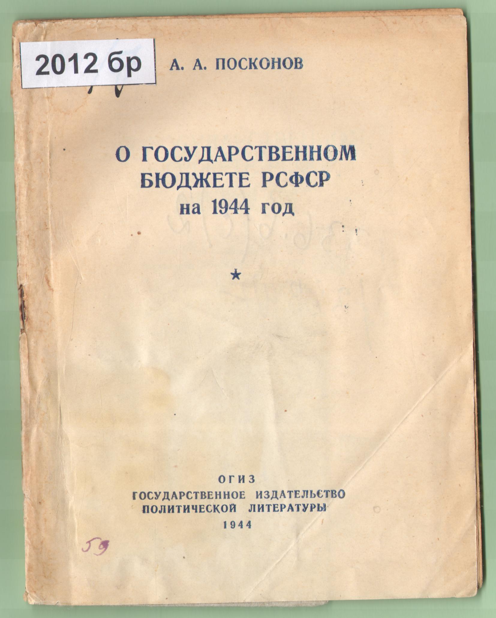 Посконов Алексей Андреевич. О государственном бюджете РСФСР на 1944 год. Доклад Народного комиссара финансов РСФСР на V сессии Верховного Совета РСФСР 1-го созыва 1 марта 1944 года / А.А. Посконов. – Москва: ОГИЗ Государственное издательство политической литературы, 1944. – 38 с. : портр.
