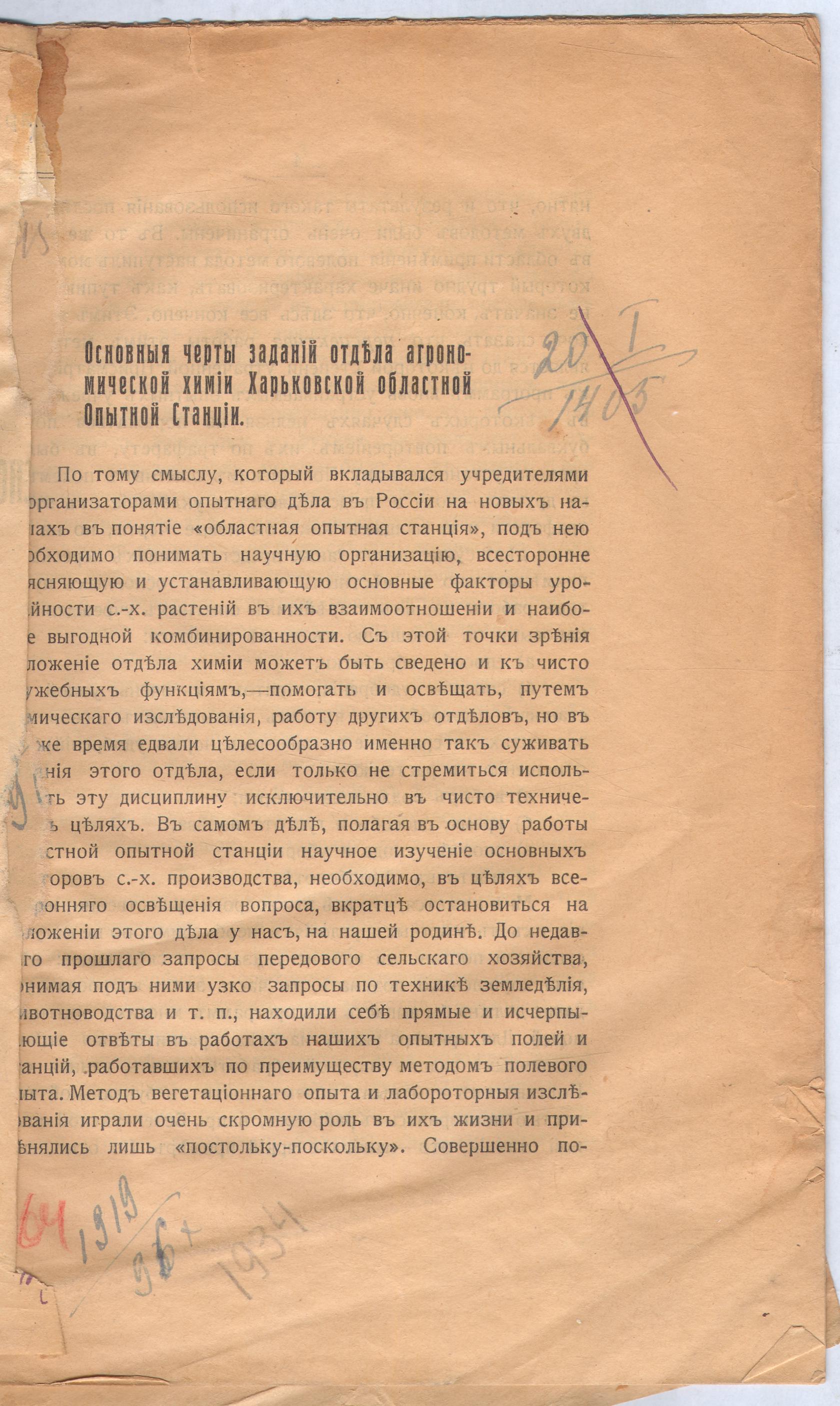 Основные черты заданий отдела агрономической химии Харьковской Областной Опытной Станции