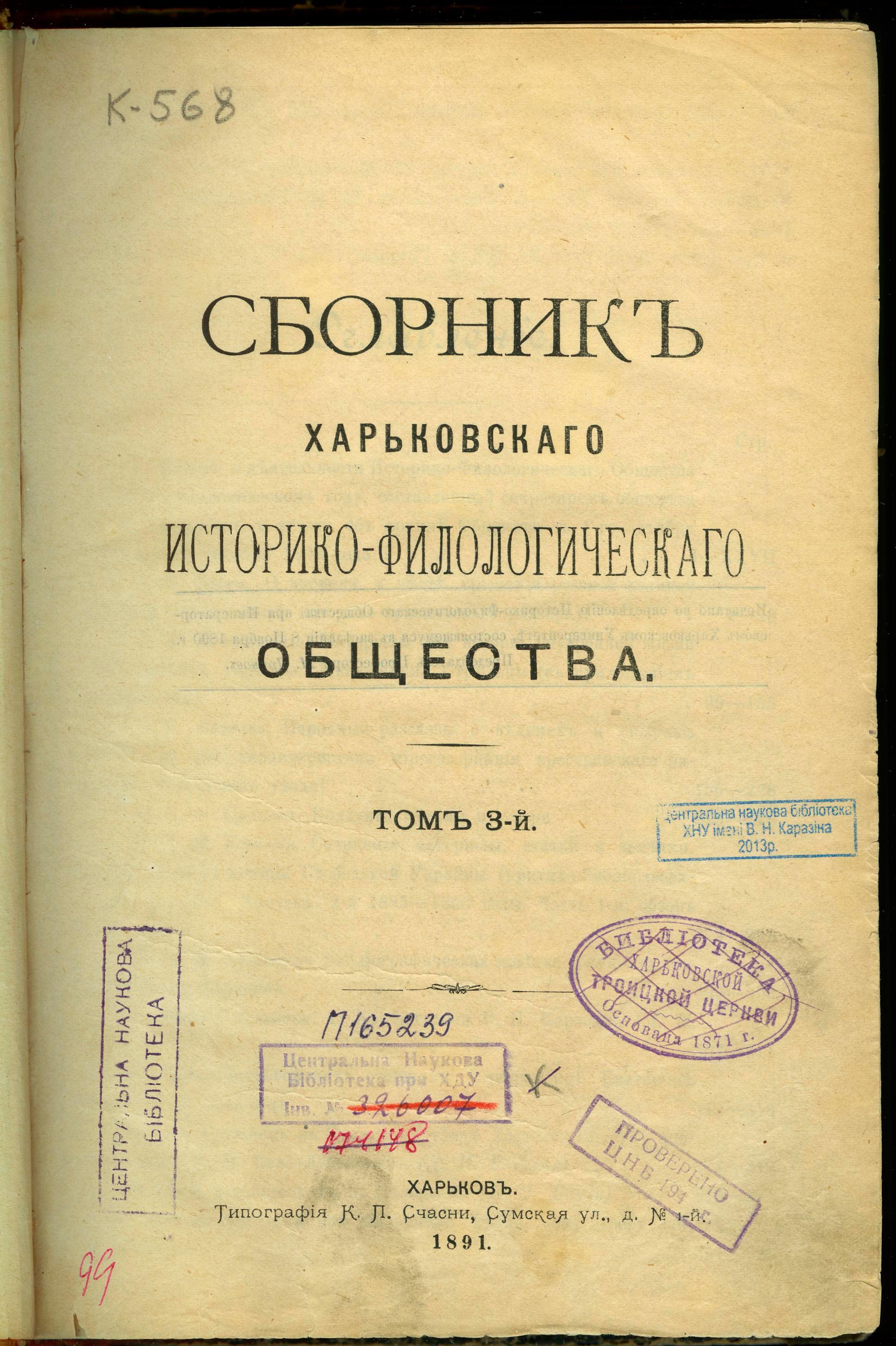 Сборник Харьковского историко-филологического общества. Том 3. / Харьковский Имп. университет. Историко-филологическое общество . – Харьков : Типография К.П. Счасни, 1891. – XXVII, 341 с.