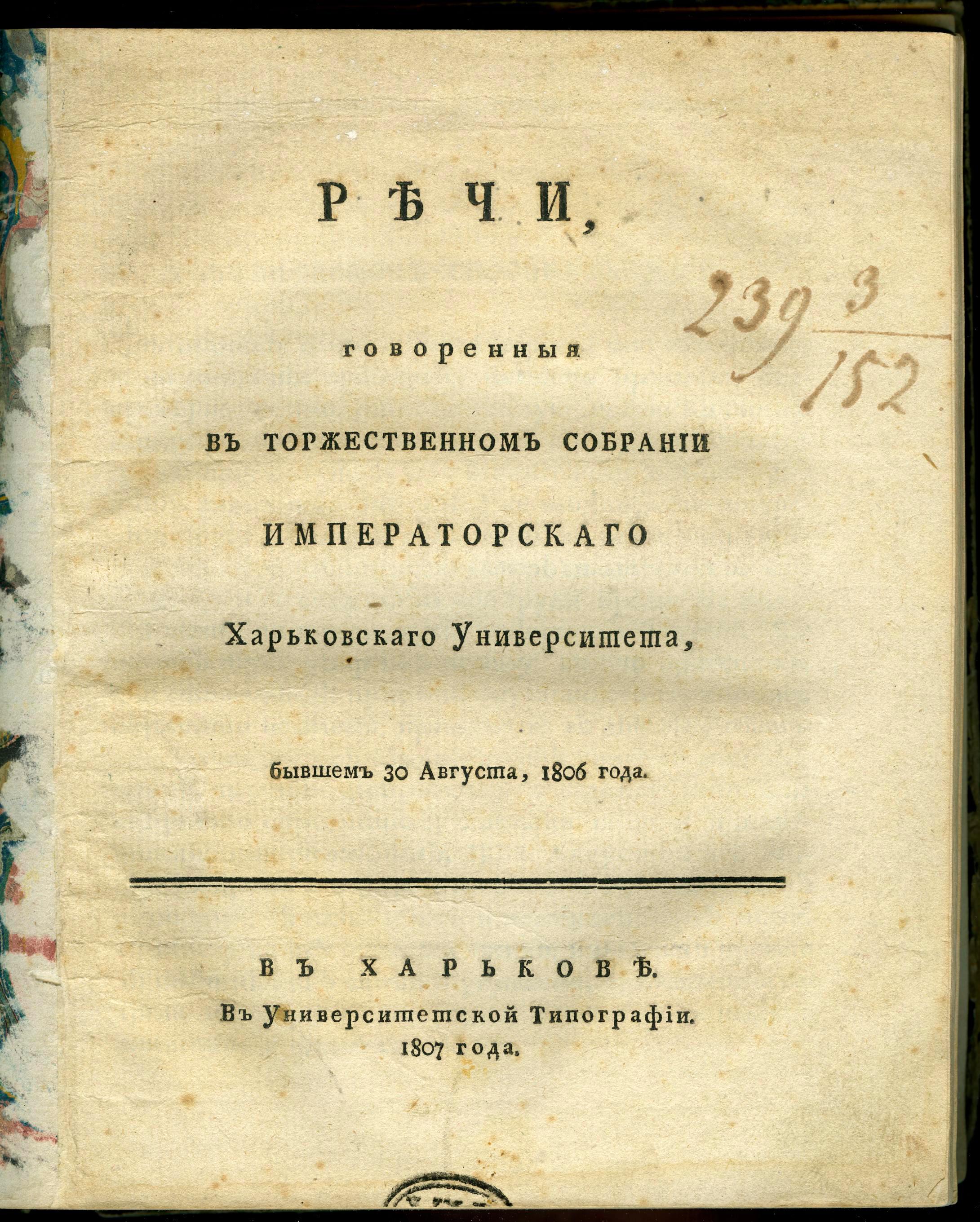Речи, говоренные в торжественном собрании Императорского Харьковского университета, бывшем 30 августа 1806 г.