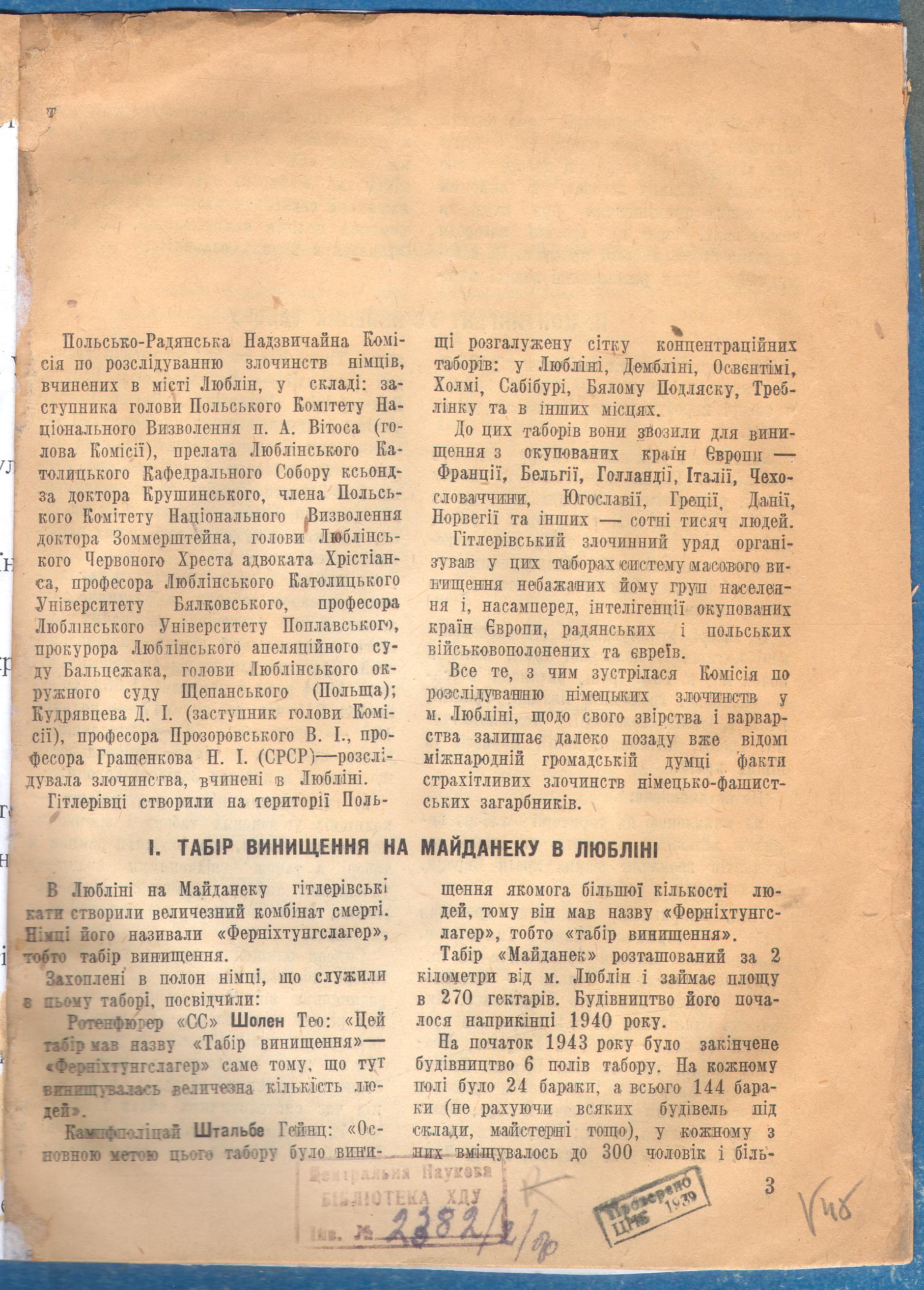 Research Subject Categories::HUMANITIES and RELIGION::History and philosophy subjects::History subjects::History, Research Subject Categories::SOCIAL SCIENCES::Other social sciences::Military intelligence and security service, Польща, Poland, history of Poland, Польсько-Радянська Надзвичайна Комісія по розслідуванню злочинств німців, табір винищення на Майданеку в Люблині, «Ферніхтунгслагер», контингент ув’язнених табору, катування в таборі винищення, масові розстріли військовополонених в таборі, масові розстріли цивільного населення в таборі, задушення газом, концентраційний табір «Майданек», звірства німецько-фашистських загарбників, воєнна історія, Велика Вітчизняна війна, Друга світова війна, The Second World War