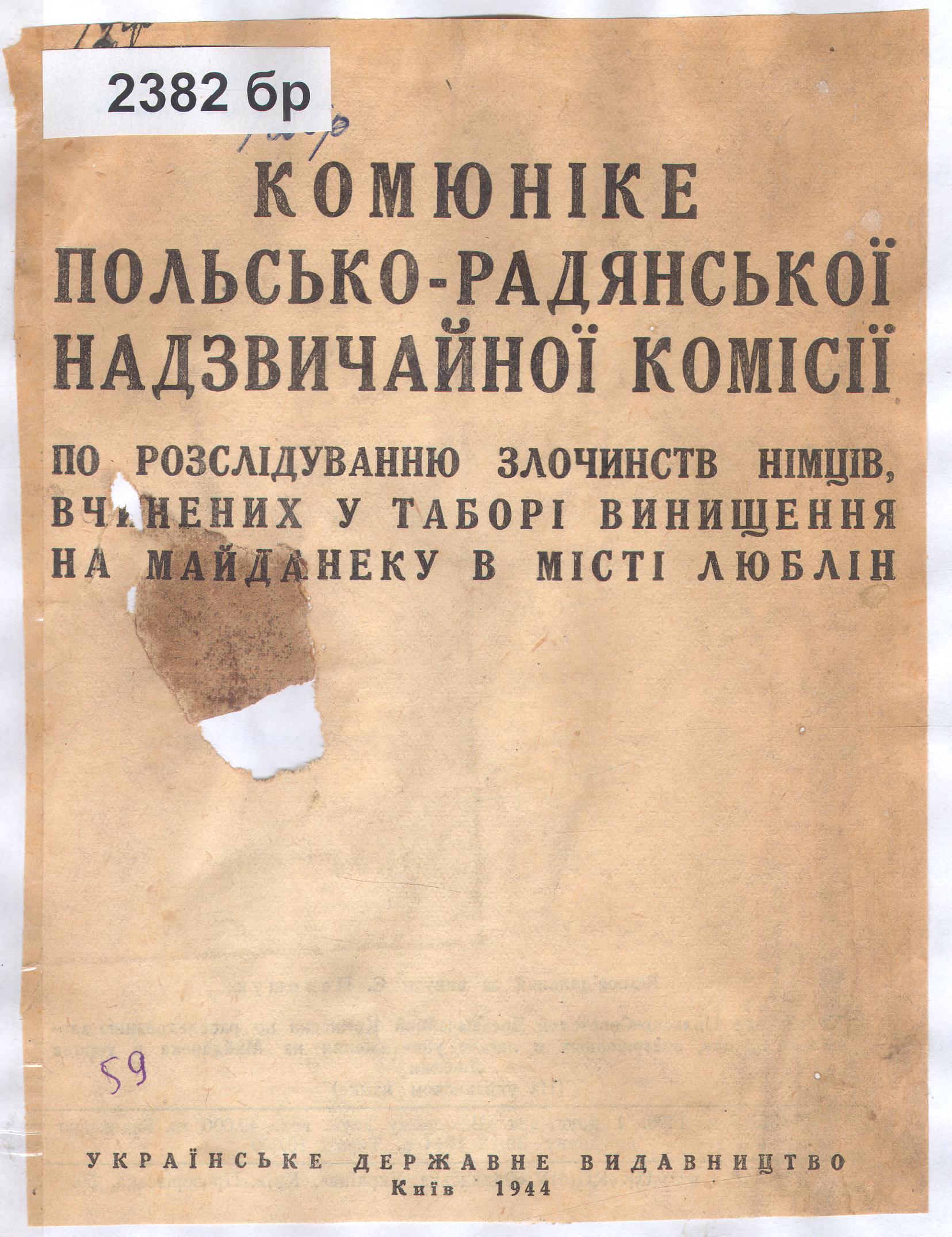Комюніке Польсько-Радянської Надзвичайної Комісії по розслідуванню злочинств німців, вчинених у таборі винищення на Майданеку в місті Люблін. – Київ: Українське державне видавництво , 1944. – 15 с.