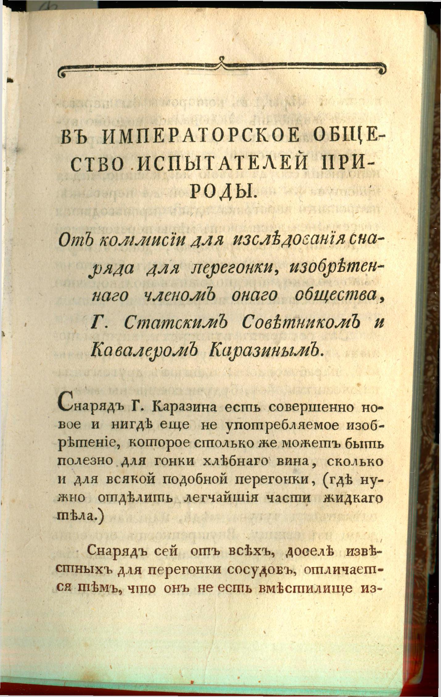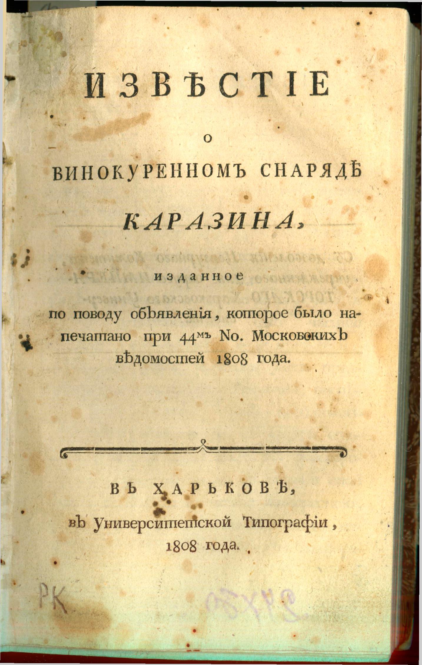 Известие о винокуренном снаряде Каразина, изданное по поводу объявления, которое было напечатано при 44м № Московских ведомостей 1808 года